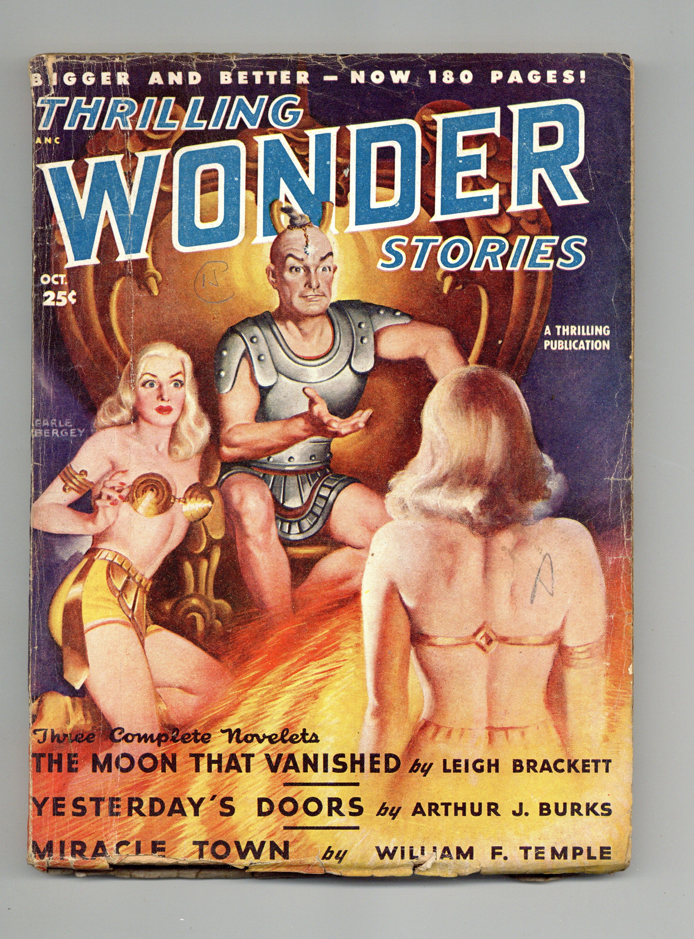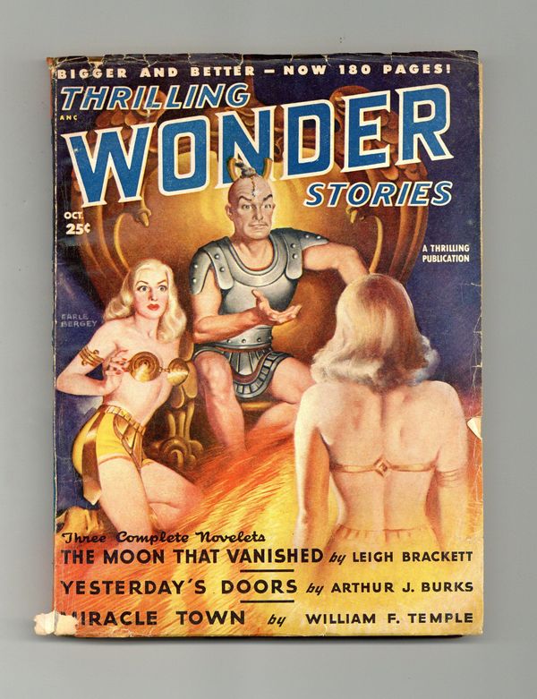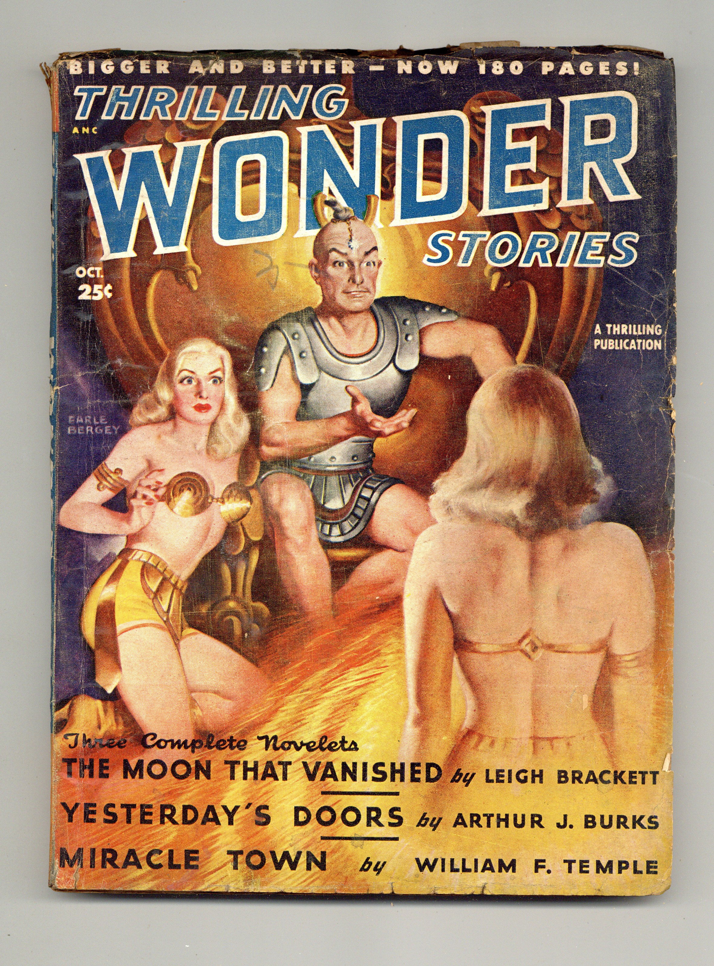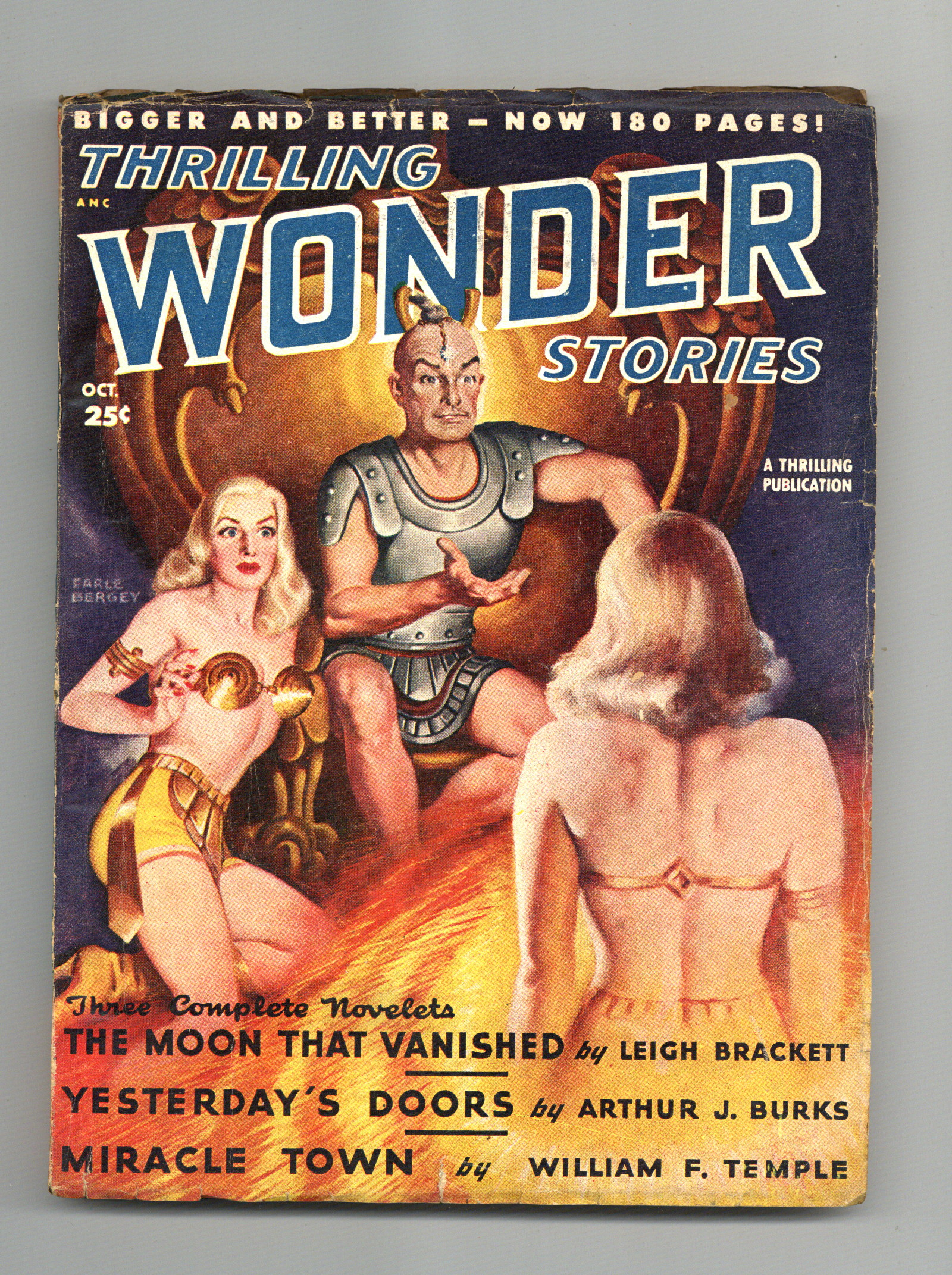 Oct 1948. Cover by Earle K. Bergey. Stories by Leigh Brackett, Arthur J. Burks, William F. Temple, Ray Bradbury, John D. MacDonald, Frank Belknap Long, Joe Gibson, George O. Smith, Benj. Miller, John S. Carroll, Noel Loomis, Donald Laverty, and Brett Sterling. Seven Virgil Finlay illustrations. 7-in. x 10-in.; black and white; 180 newsprint pages. Cover price $0.25.