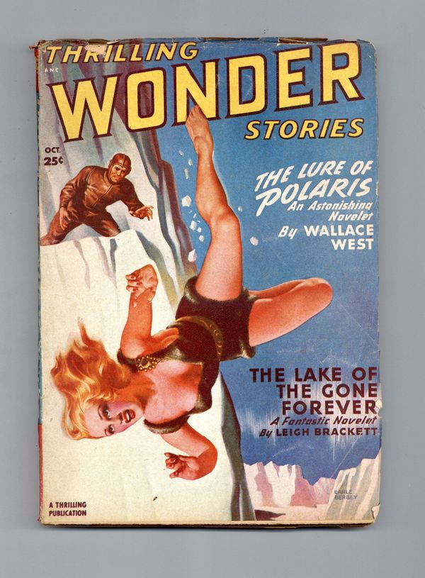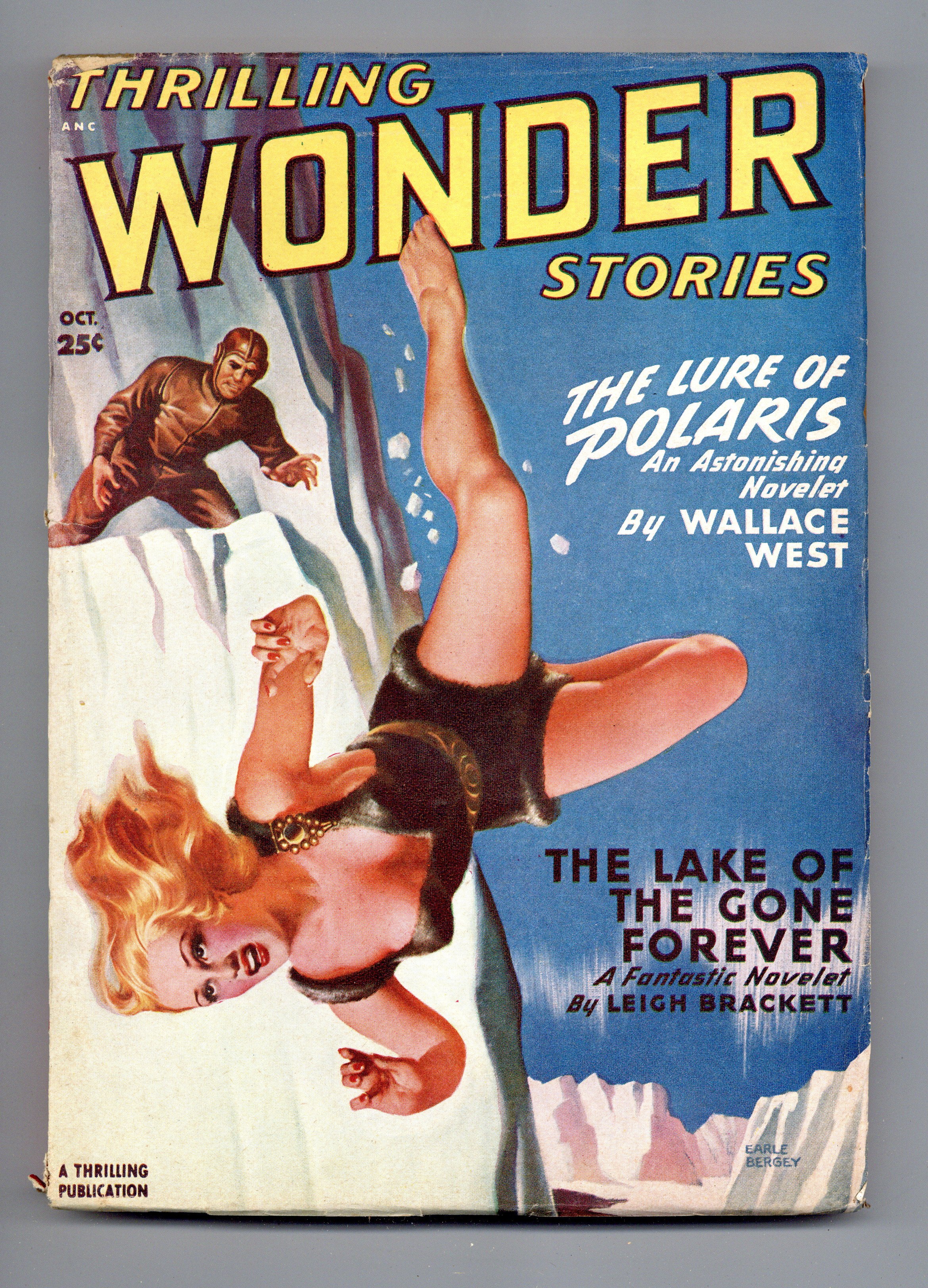 Volume 35, Issue 1 - October, 1949. Cover by Earle K. Bergey. Stories by Wallace West, Leigh Brackett, Ray Bradbury, L. Sprague de Camp, Cleve Cartmill, Henry Kuttner, Margaret St. Clair, Murray Leinster, Manly Wade Wellman, L. Ron Hubbard, and Edwin James. One Virgil Finlay illustration. 7-in. x 10-in.; black and white; 168 newsprint pages. Cover price $0.25.
