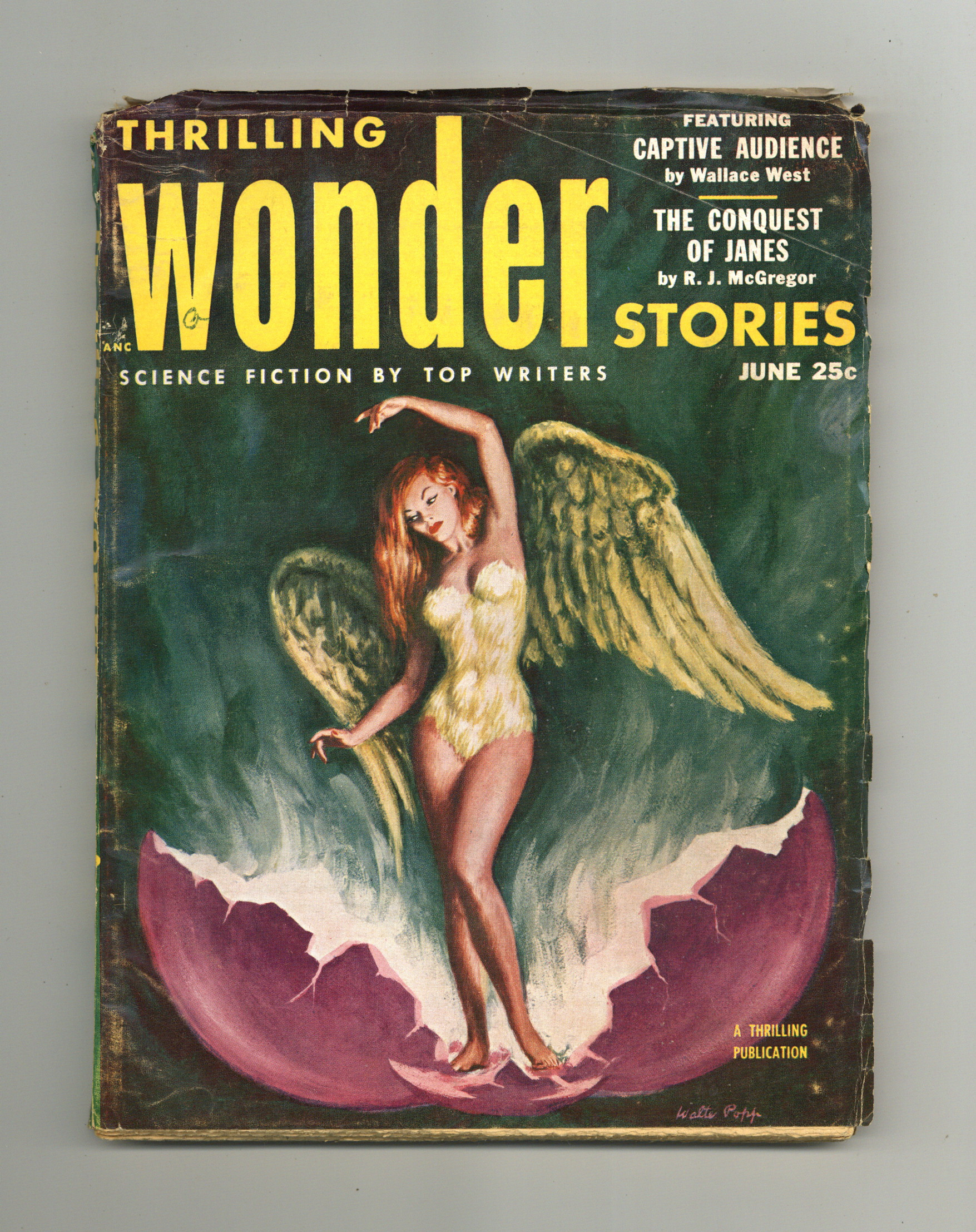 June, 1953. Cover by Walter Popp. Stories by Wallace West, R.J. McGregor, Chad Oliver, J.W. Groves, Kris Neville, John Christopher, and Murray Leinster. Three Virgil Finlay illustrations. 7-in. x 10-in.; black and white; 148 newsprint pages. Cover price $0.25.