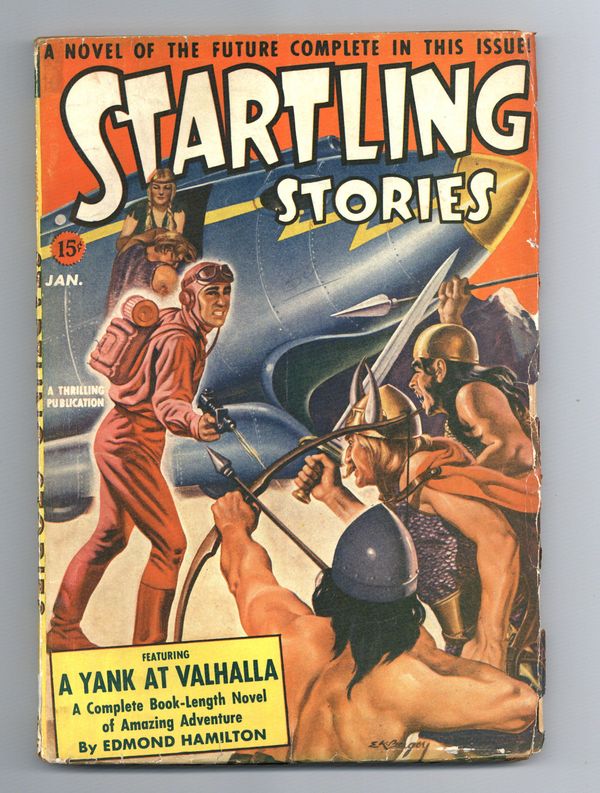 January 1941. Cover by Earle K. Bergey. Stories: "A Yank At Valhalla" by Edmond Hamilton, "The Hyper Sense" by Lloyd Arthur Eshbach, "The City of Singing Flame" by Clark Ashton Smith, and "The Demons of Darkside" by Leigh Brackett. Softcover Pulp, 6 1/2-in x 9 1/2-in, 130 Pages, B&W. Cover price $0.15.