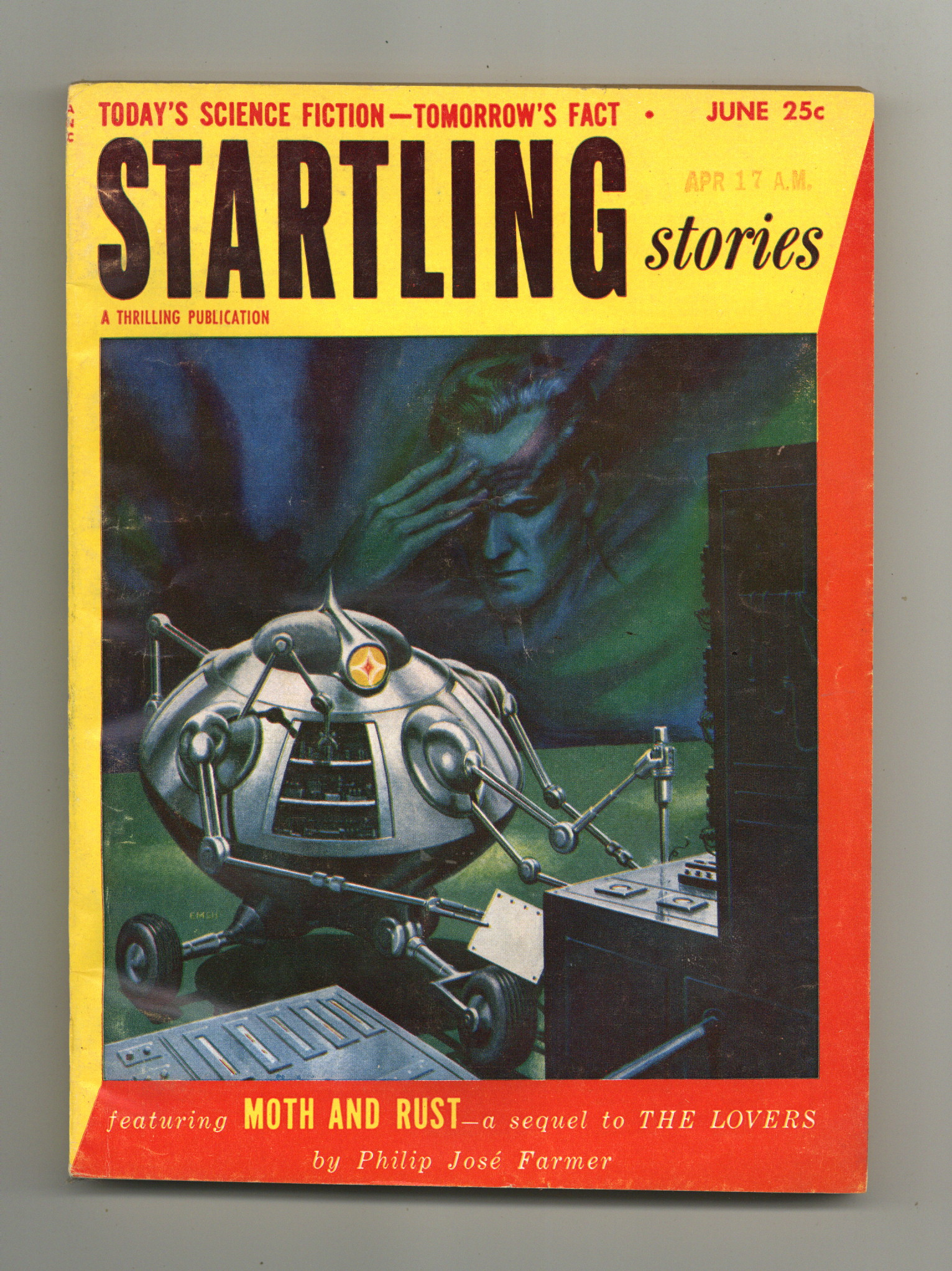 Published Jun 1953 by Better Publications.$8.00June 1953. Cover by Ed Emshwiller. Stories by Philip Jose Farmer "Moth and Rust" (sequel to "The Lovers"), Fox B. Holden, Leslie Waltham, and Robert F. Young. Virgil Finlay (3) and Emsh illustrations. 6.5-in. x 9-in. trimmed format; black and white; 146 pages. Cover price $0.25.