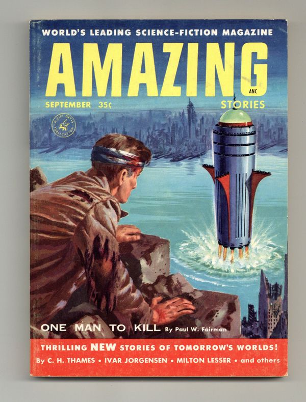 Published Sep 1955 by Experimenter Publications.$18.00Sept 1955. Science fiction stories by Paul W. Fairman, Milton Lesser, C.H. Thomes, and Ivar Jorgensen. Cover by Edward Valigursky. 5-1/2 in. x 7-1/2 in.; black and white; 130 newsprint pages. Cover price $0.35.