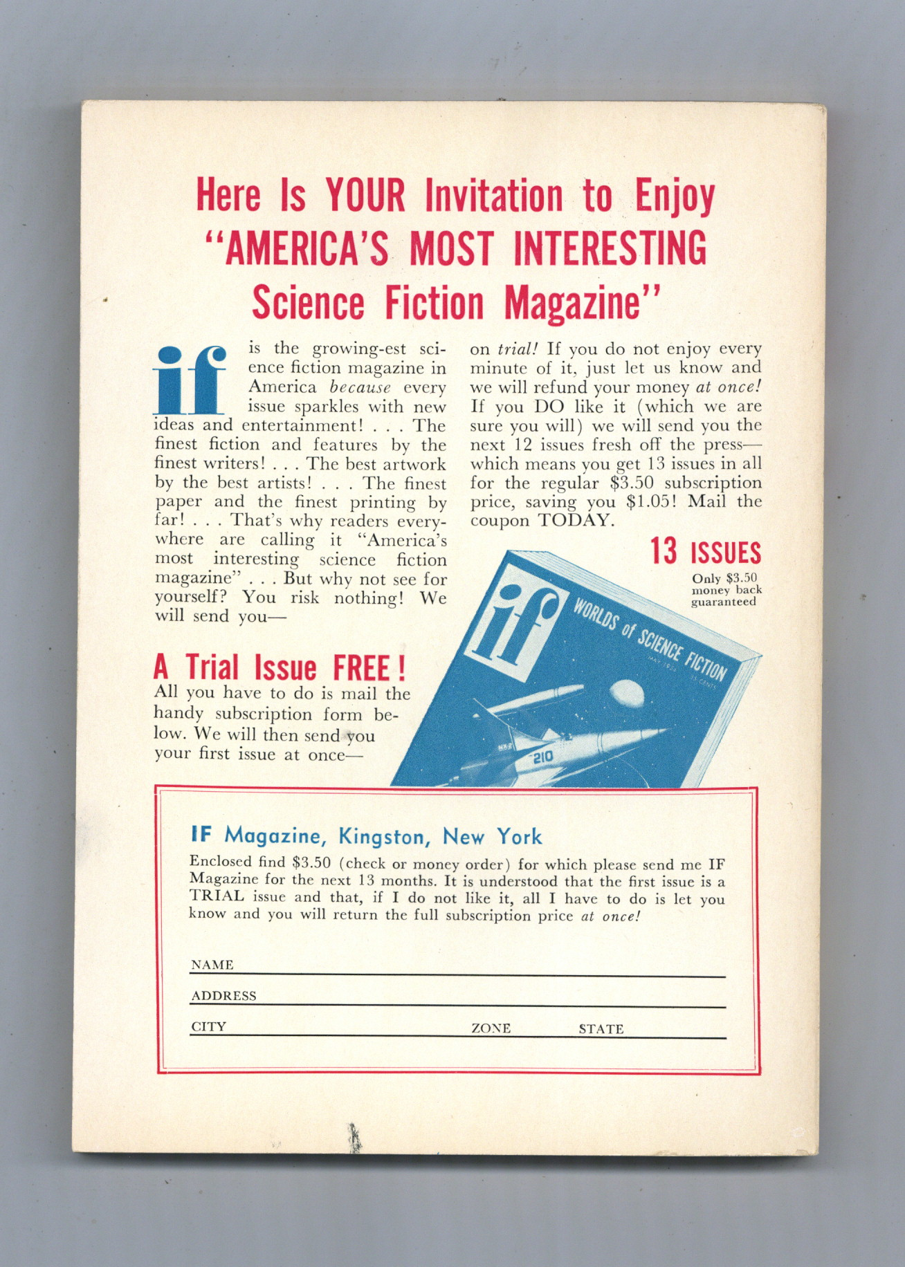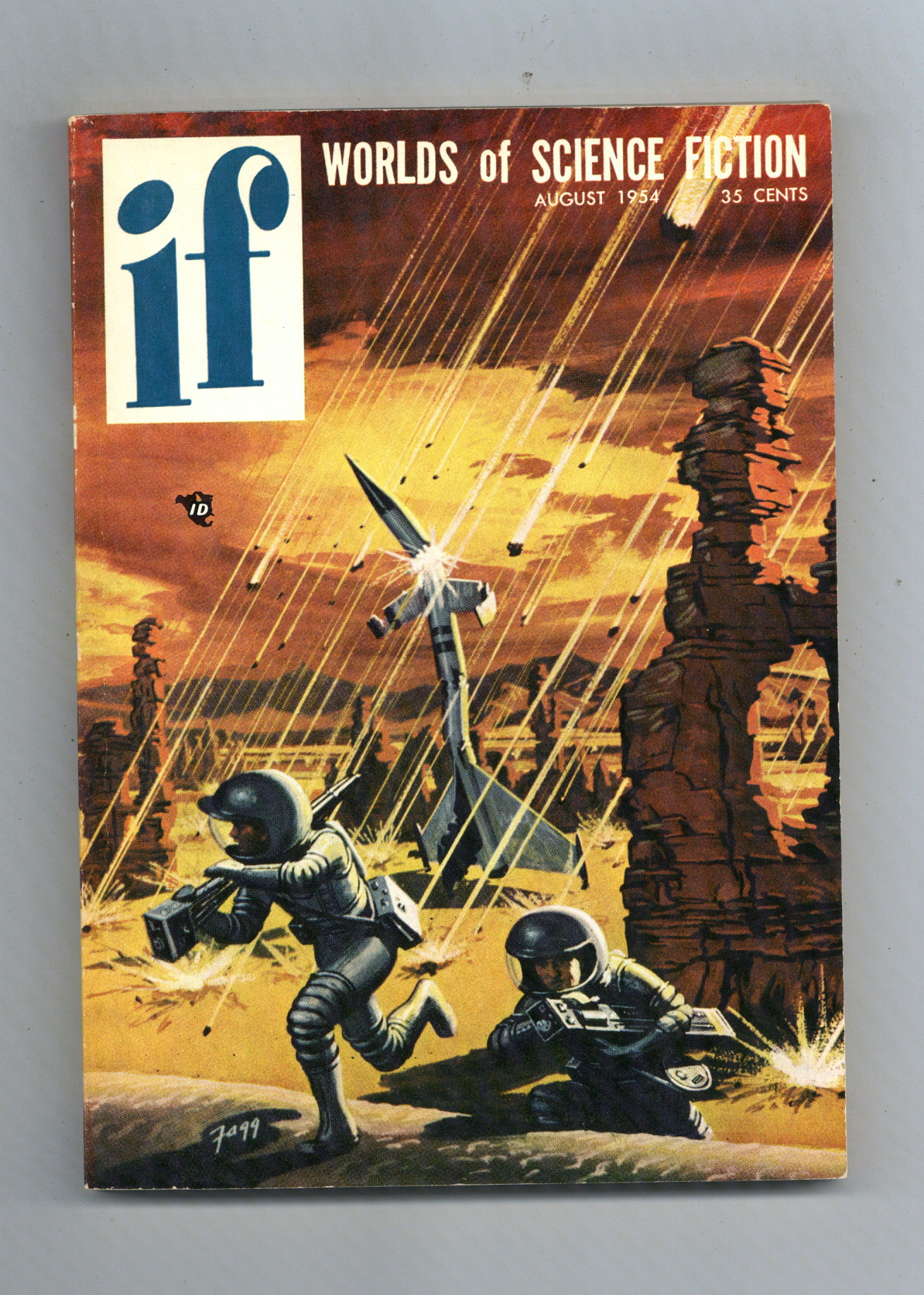 Published Aug 1954 by Quinn Publishing Co..$27.00Aug 1954. Science fiction stories by Raymond F. Jones, Robert Sheckley, Richard Matheson, Poul Anderson and Theodore Cogswell, William F. Nolan, and Philip K. Dick. Virgil Finlay (3) and Kelly Freas illustration. Cover by Ken Fagg. 5.25-in. x 7.5-in.; black and white; 120 newsprint pages. Cover price $0.35.