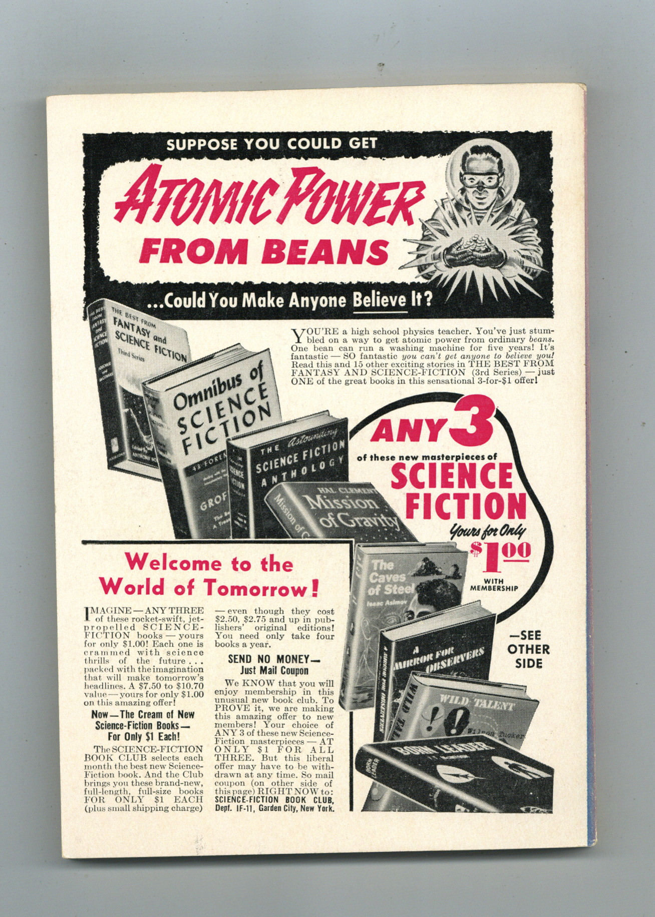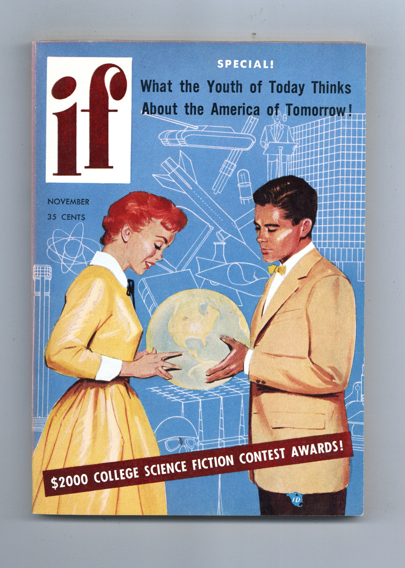 Published Nov 1954 by Quinn Publishing Co..$56.00Nov 1954. Science fiction stories by Gordon R. Dickson, Patrick Wilkins, Basil Wells, Philip K. Dick, William E. Bentley, Vernon L. McCain, John Christopher, and Mari Wolf. Brief Andrew ("Andy") Offut bio (he won the publication's story-writing contest). Virgil Finlay and Kelly Freas illustrations. Cover by Bob Watkins. 5.25-in. x 7.5-in.; black and white; 120 newsprint pages. Cover price $0.35.