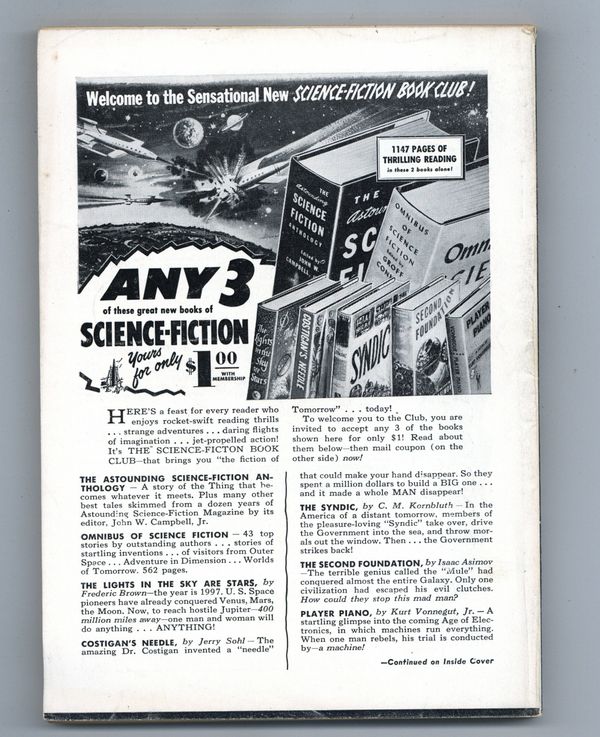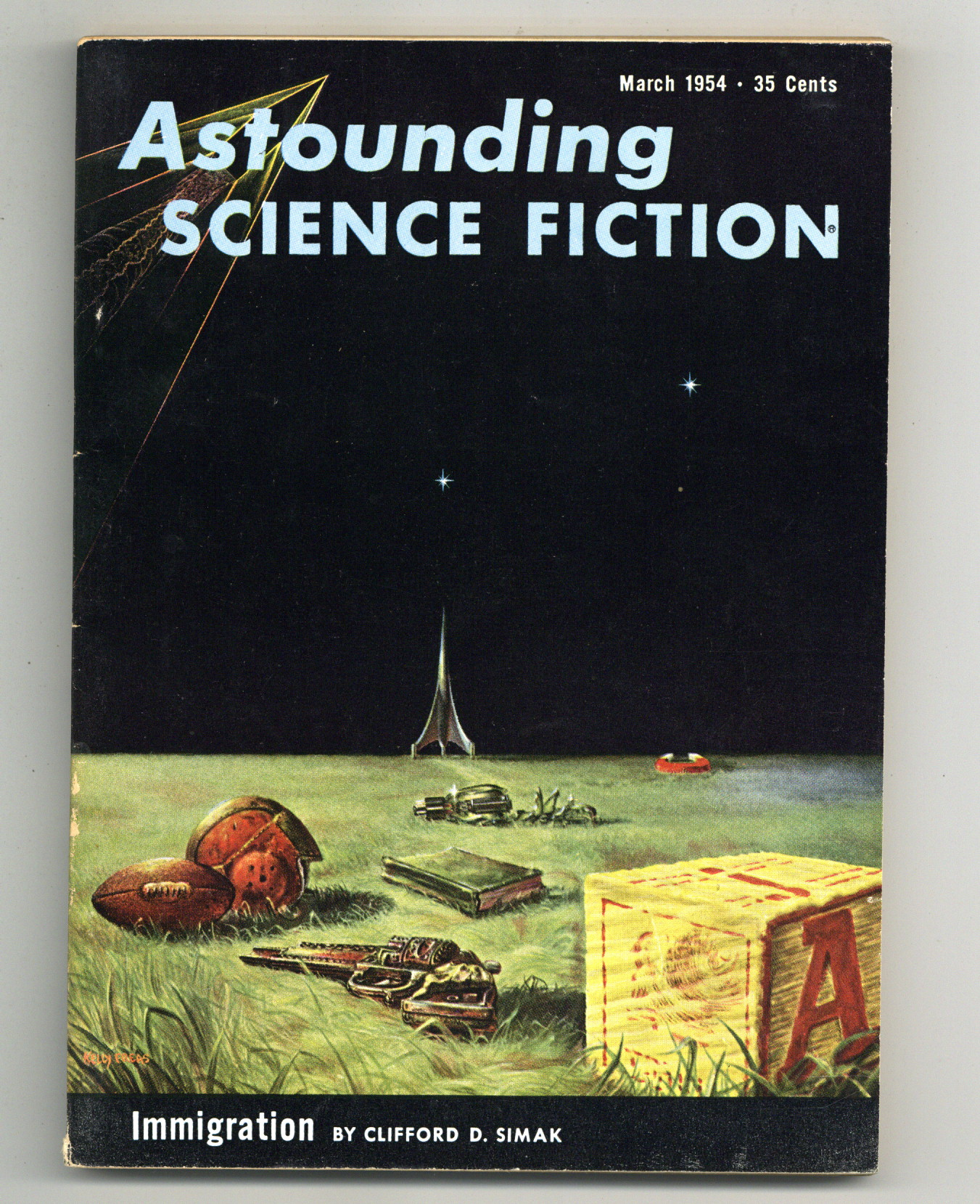 Published Mar 1954 by Street & Smith.$12.75March 1954. Volume 53, Issue 1 - 1st printing. Science fiction stories by Clifford D. Simak, Isaac Asimov ("Sucker Bait" part 2), Arthur Zirul, and Walter M. Miller Jr. Illustrations by Freas, Sussman, and van Dongen. Article on topology. Cover by Kelly Freas. Softcover, 5.5-in. x 7.75-in.; 168 newsprint pages, B&W. Cover price $0.35.