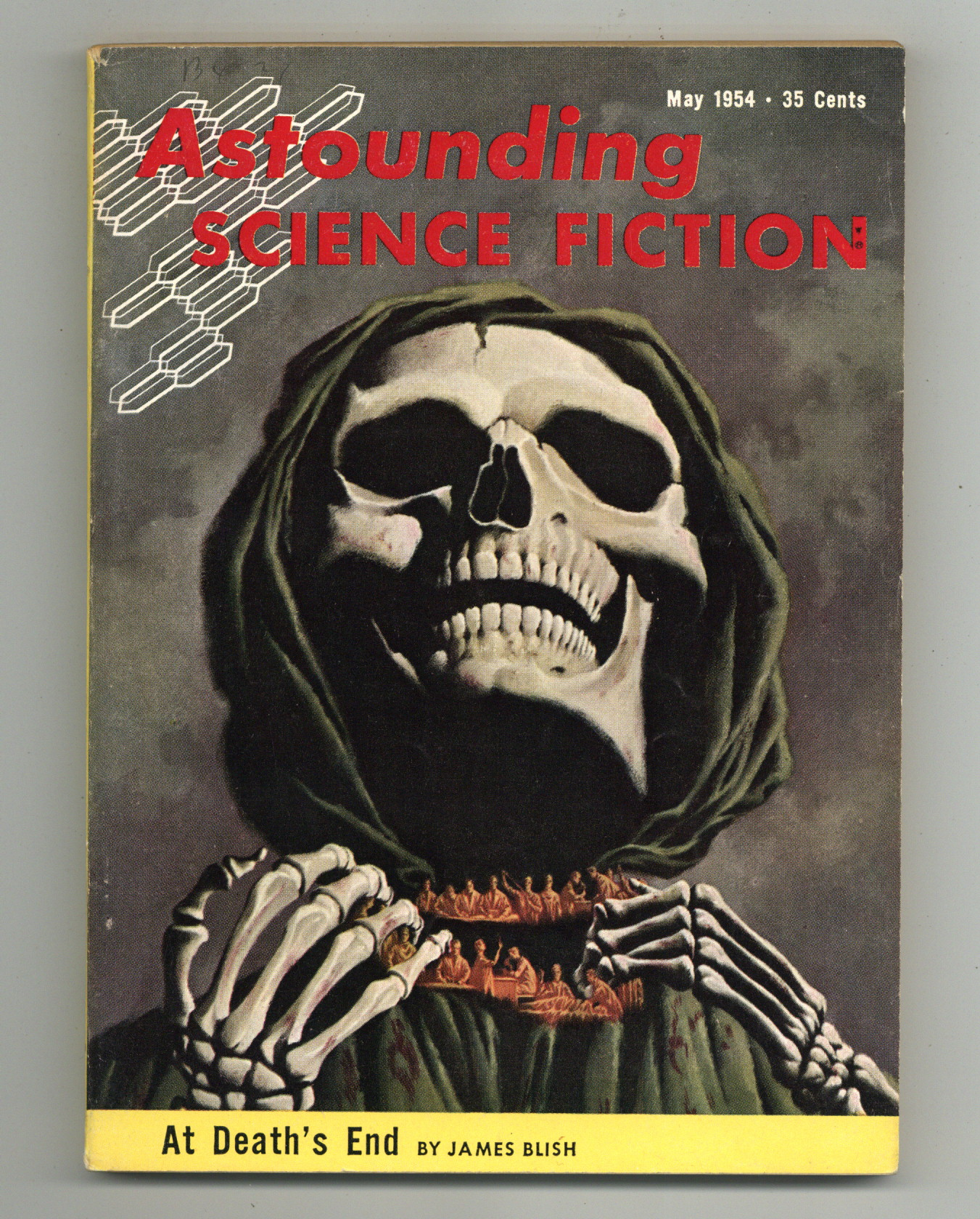 Published May 1954 by Street & Smith.$200.001st printing. Volume 53, Issue 3 - May, 1954. Cover by van Dongen. Stories by James Blish, J.T. M'Intosh, Eric Frank Russell, Chad Oliver, Morton Klass and Algis Budrys. Illustrations by Freas and van Dongen. Novelettes: "At Death's End" by James Blish and "Bias" by J.T. M'Intosh. Short stories: "Weak Spot" by Eric Frank Russell; "Of Course" by Chad Oliver; "Earthman's Burden" by Morton Klass; and "First to Serve" by Algis Budrys. Articles: "Tornadoes and Atom Blasts" by J.O. Hutton and "Orthodoxy in Science" by L. Sprague de Camp. Readers' departments: The Editor's Page; In Times to Come; The Analytical Laboratory; The Reference Library by P. Schuyler Miller; and Brass Tacks. Softcover, 5 1/2-in. x 8-in., 168 newsprint pages, B&W. Cover price $0.35.