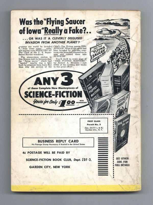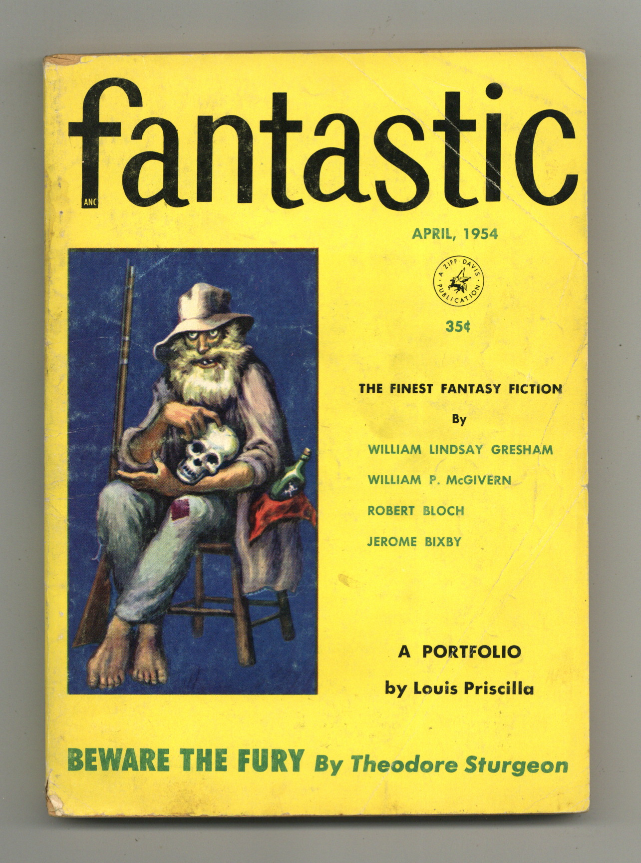 Published Apr 1954 by Ziff Davis.$5.00April 1954. Science fiction and fantasy stories by Theodore Sturgeon, William Lindsay Gresham, William P. McGivern, Robert Bloch, Jerome Bixby, Doris E. Kaye, and Naille Wilde. Cover by Augusto Marin. 5.5-in. x 7.75-in.; black and white; 128 newsprint pages. Cover price $0.35.