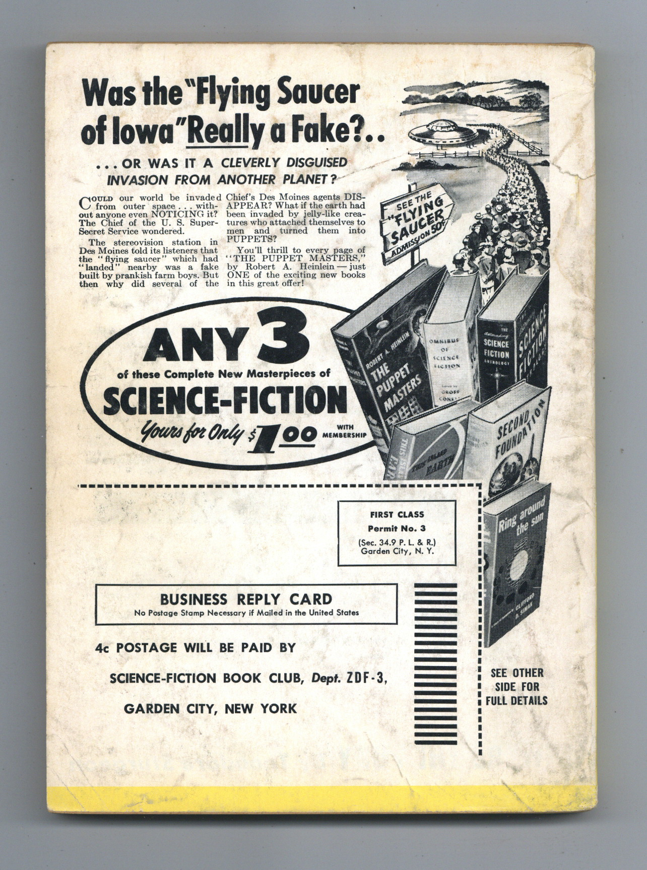 April 1954. Science fiction and fantasy stories by Theodore Sturgeon, William Lindsay Gresham, William P. McGivern, Robert Bloch, Jerome Bixby, Doris E. Kaye, and Naille Wilde. Cover by Augusto Marin. 5.5-in. x 7.75-in.; black and white; 128 newsprint pages. Cover price $0.35.