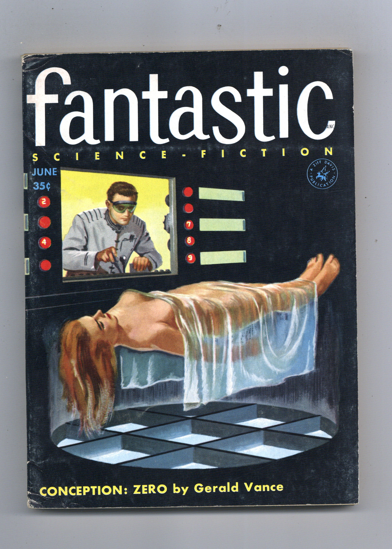 Published Jun 1956 by Ziff Davis.$8.40June 1956. Science fiction and fantasy stories byRobert Silverberg, Gerald Vance, Milton Lesser, C.H. Thames, and Karl Stanley. Virgil Finlay illustration. Cover by Edward Valigursky. 5.5-in. x 7.75-in.; black and white; 128 newsprint pages. Cover price $0.35.