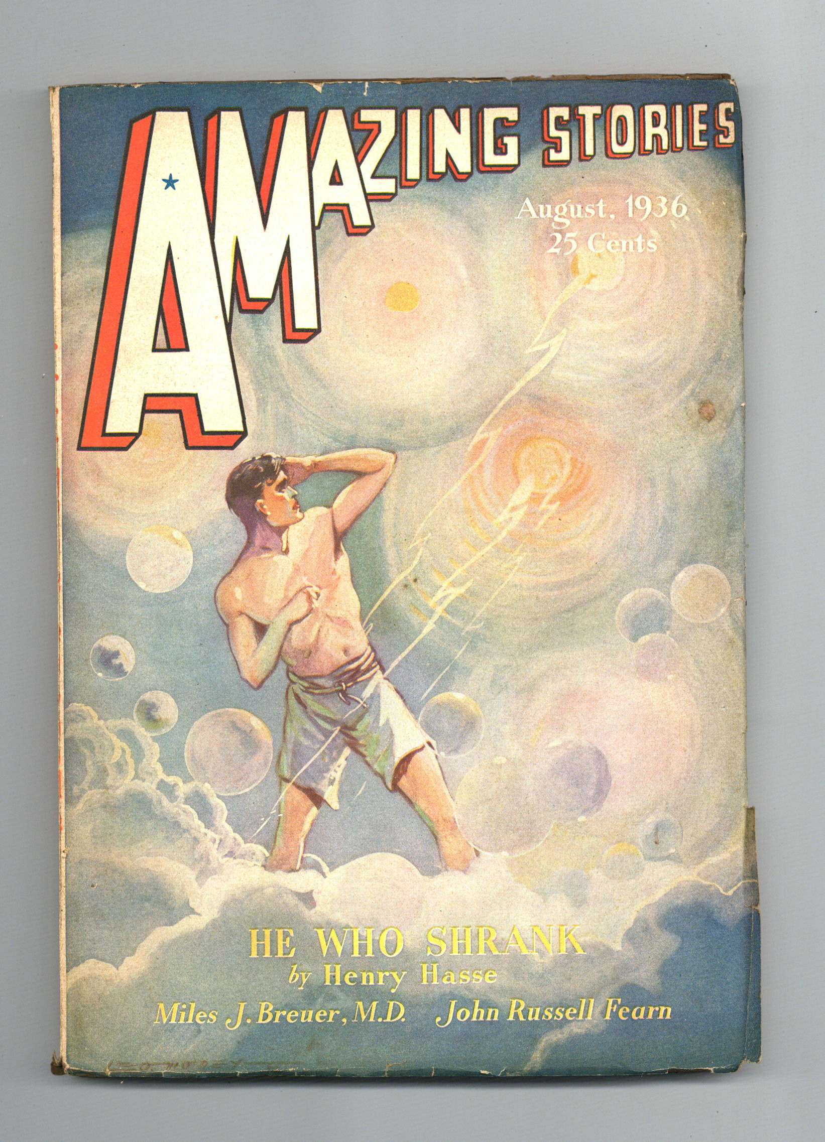 Aug 1936. Cover and illustrations by Leo Morey. Science fiction stories by William Lemkin, Henry Hasse, John Russell Fearn, and Miles J. Breuer. 6.75-in. x 9.75-in.; black and white; 144 newsprint pages Cover price $0.25.