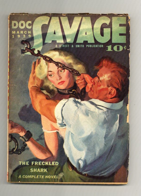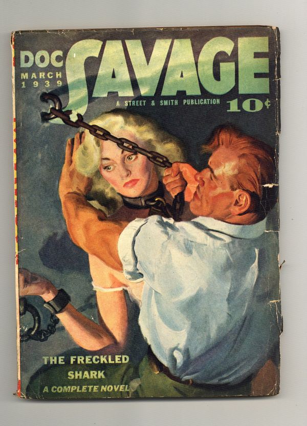 March 1939. Stories include "The Freckled Shark," a book-length novel by "Kenneth Robeson"; "It Pays to Fight" by Wallace Brooker; "Pass of Death" by Norman E. Daniels; and "Dog Sledge Express" by Jack Storm. 7-in. x 10-in.; black and white; 128 newsprint pages. Cover price $0.10.