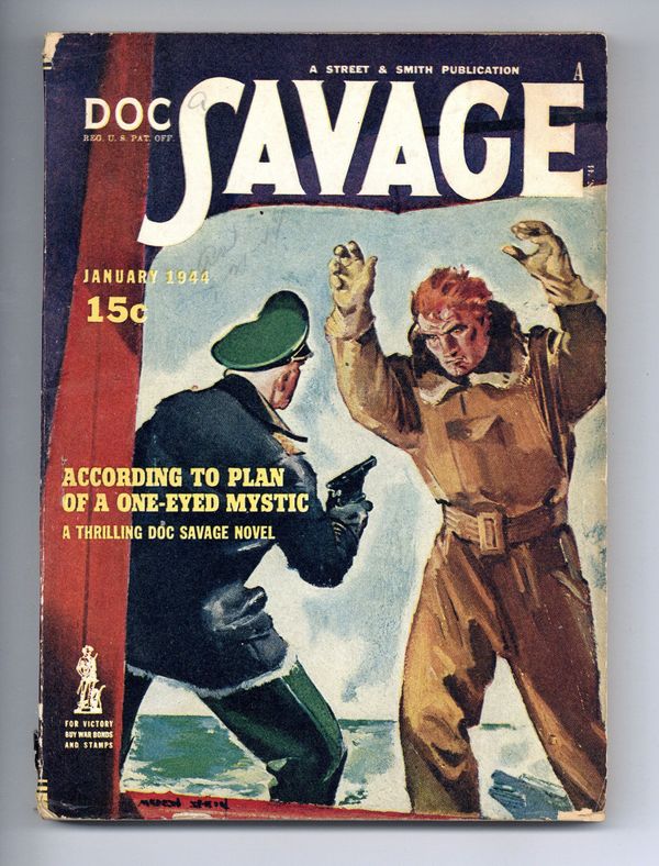 January 1944. 1st digest-sized issue. 1st "Doc" cover by Modest Stein. Stories include "According to Plan of a One-Eyed Mystic," a book-length novel by "Kenneth Robeson"; "Phantom Raider" by R.A. Emberg; "Change of Heart" by Ray Vicker; "Underground Agent" by Norman A. Daniels; and "Fighting Man" by E.E. Halleran. 5.5-in x 7.75-in.; black and white; 128 newsprint pages. Cover price $0.15.