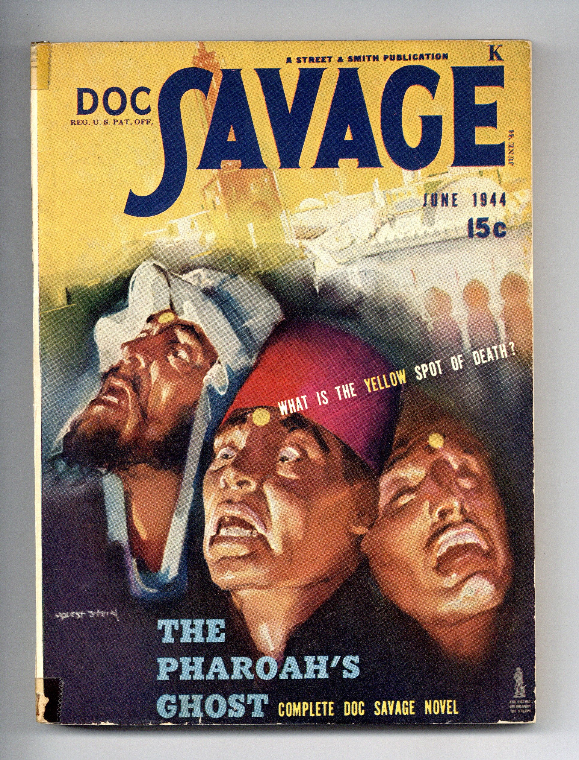 June 1944. Cover by Modest Stein. Stories include "The Pharoah's Ghost," a book-length novel by "Kenneth Robeson"; "Milly Was a Lady" by Ray Vicker; "Jungle Jazz" by Bruce Elliott; "No Grave for Freedom" by Burgess Leonard; and "Hillbilly Sailor" by Peter Reed. 5.5-in x 7.75-in.; black and white; 128 newsprint pages. Cover price $0.15.