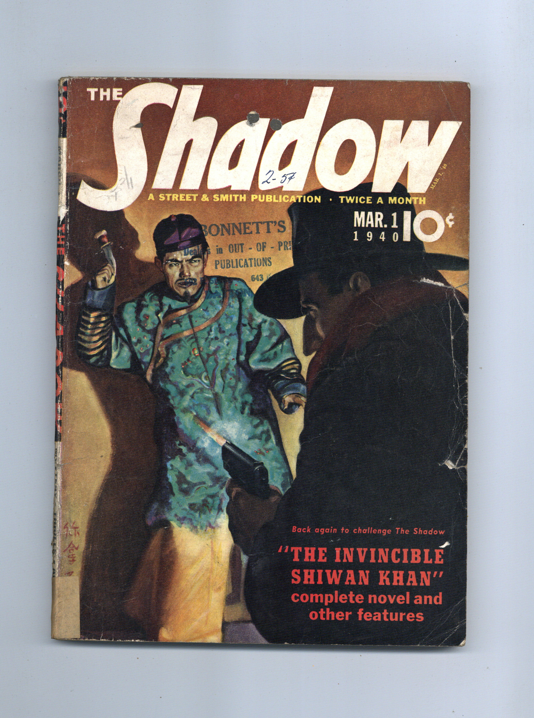 March 1, 1940. 3rd appearance of Shiwan Khan. Stories include "The Invincible Shiwan Khan" by Maxwell Grant and "Only Death Shall Pass" by Stephen Gould plus the column "Codes" by Henry Lysing. Edd Cartier illustrations. 6.5" x 9", black and white, 114 newsprint pages. Cover price $0.10.