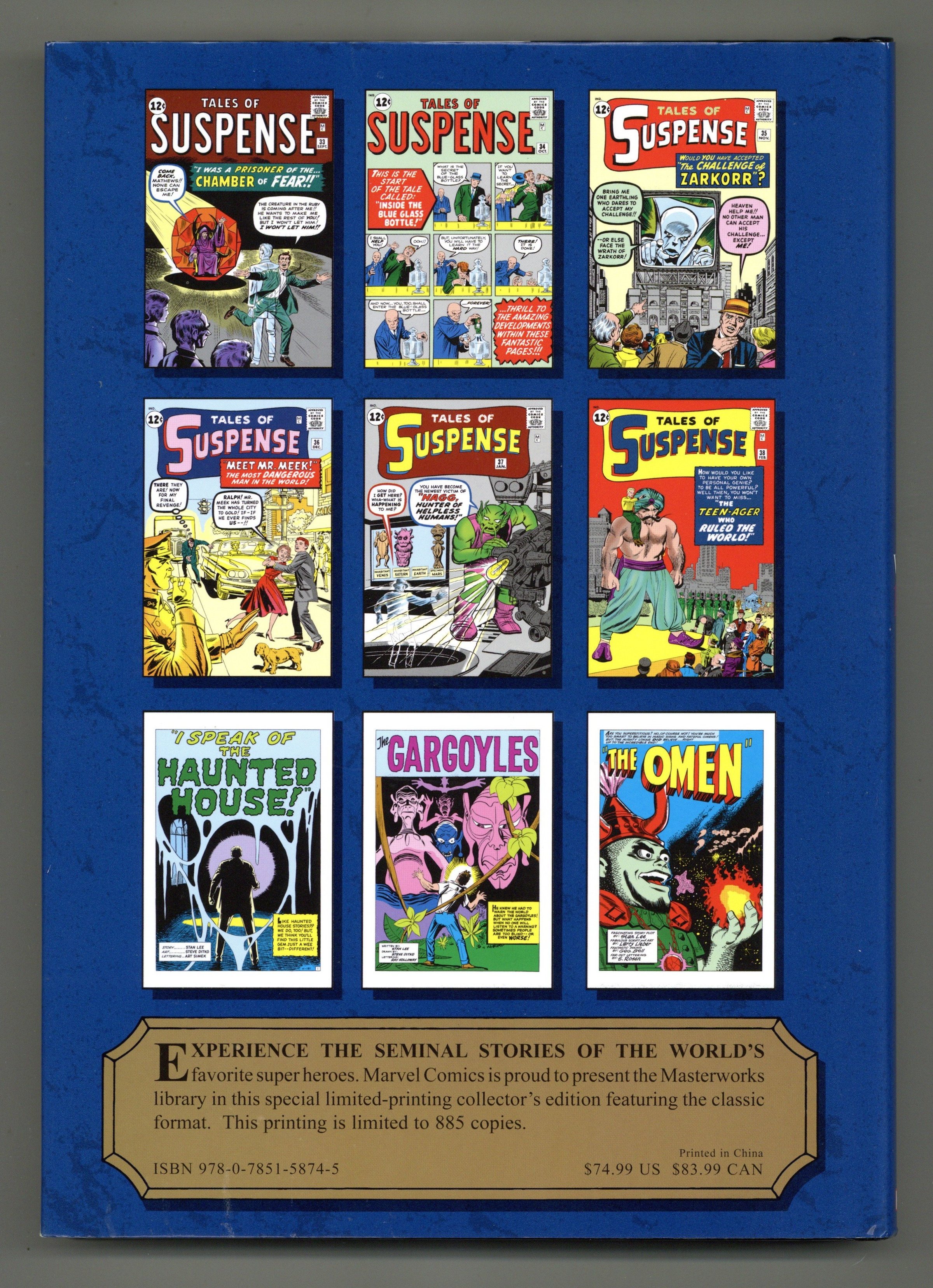 Volume 186 – 1st printing. "Atlas Era Tales of Suspense: Book 4!" Collects Tales of Suspense (1959-1968) #32-48, and #50-54. Written by STAN LEE and LARRY LIEBER. Art by JACK KIRBY, STEVE DIKTO, DON HECK and PAUL REINMAN. Cover by JACK KIRBY. The Marvel Masterworks bring you the final, fantastic volume of TALES OF SUSPENSE with another dose of giant monsters, intergalactic alien invaders and weird menaces. Including each complete pre-hero issue, as well as the many never-before-reprinted backup stories that supported Iron Man after his debut, crafted by a who's who list of top talent: Stan Lee, Jack Kirby, Steve Ditko, Don Heck, Jack Davis and more. This must-have volume brings you the stories that were the crucible for the Marvel Age of Comics, so don't wait - reserve your copy today! Hardcover, 304 pages, full color. NOTE: Limited to 885 copies. Cover price $74.99.