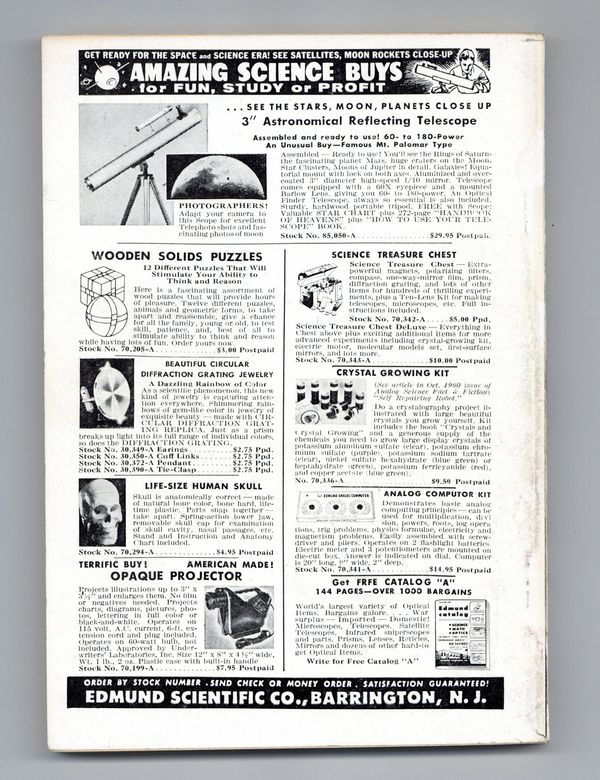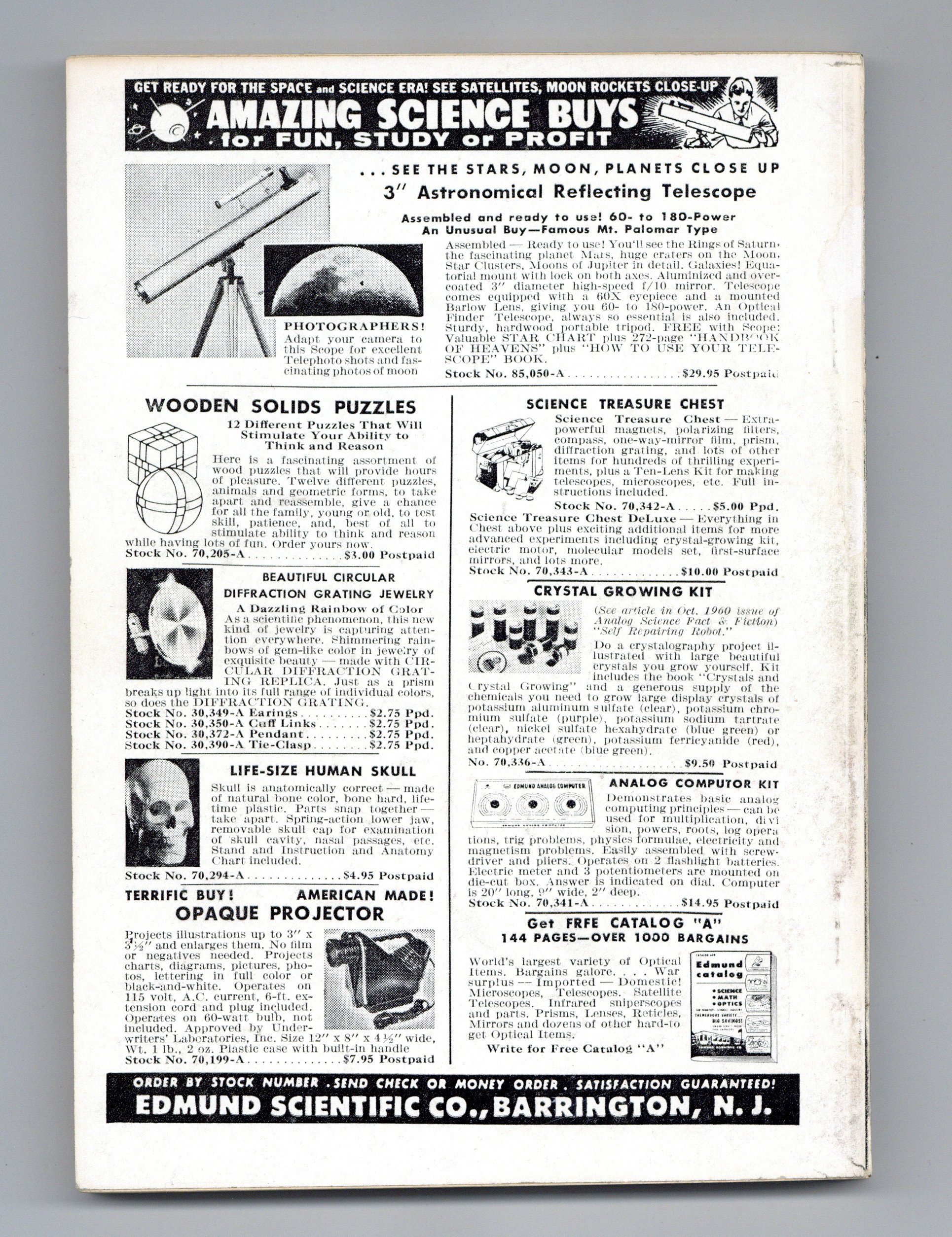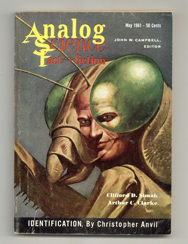 May 1961. Stories: "The Fisherman" (part 2) by Clifford D. Simak, "Death and the Senator" by Arthur C. Clarke, "Gone Fishing" by James H. Schmitz, "Join Our Gang?" by Sterling E. Lanier, and "Identification" by Christopher Anvil. Science fact feature, "Science Fiction is Too Conservative" by G. Harry Stine. Cover by Schoenherr. Illustrations by Schoenherr, Douglas, Krenkel, and van Dongen. Softcover, 5.5-in. x 7.5-in.; 178 newsprint pages, B&W. Cover price $0.50.
