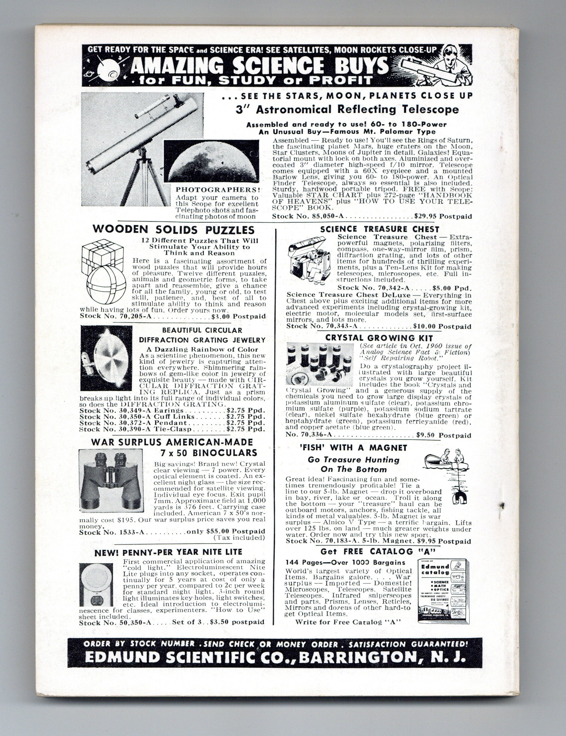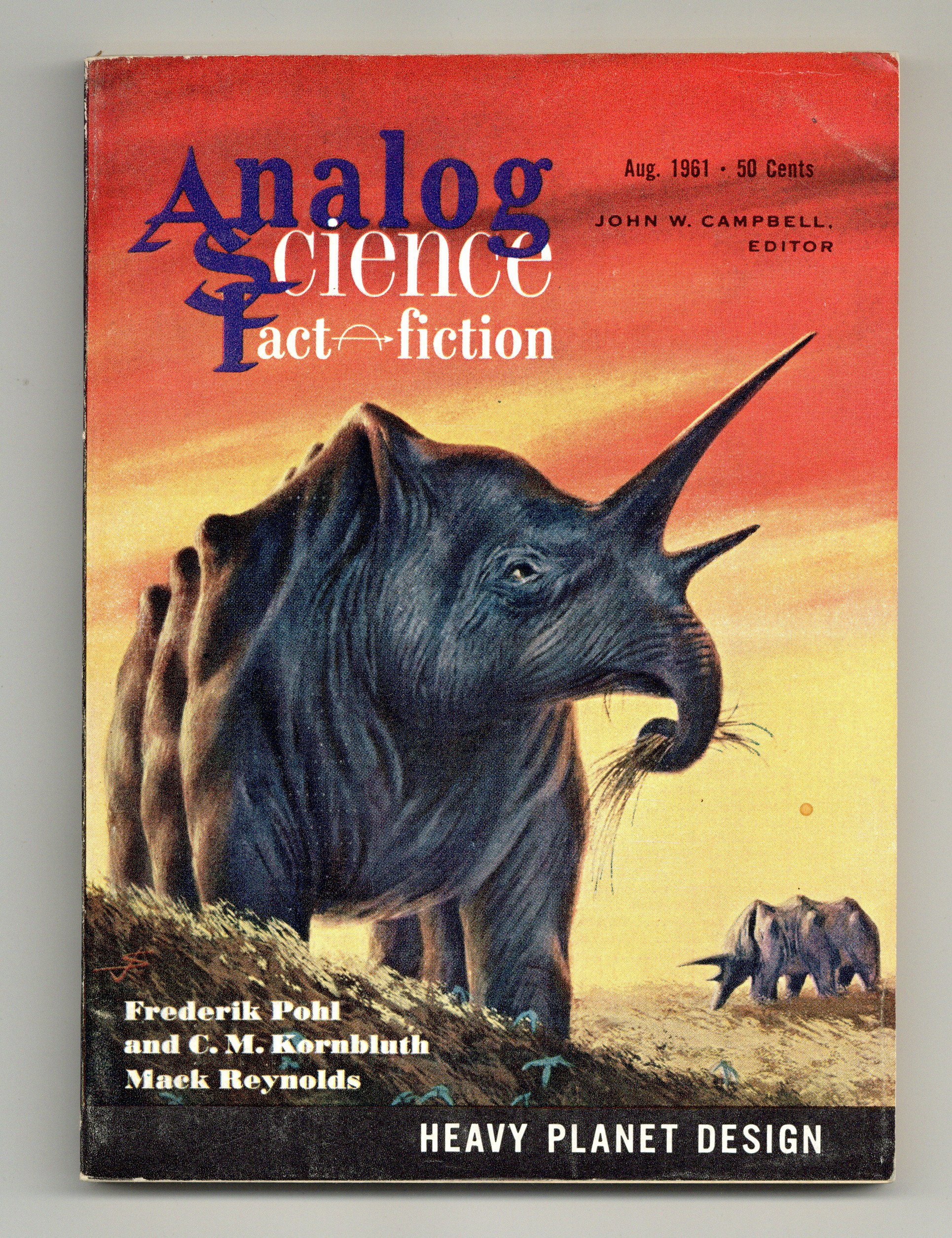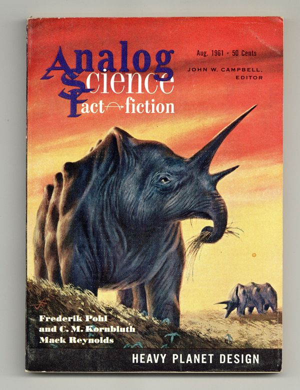August 1961. Stories: "Status Quo" by Mack Reynolds, "The Quaker Cannon" by Frederik Pohl and C.M. Kornbluth, "Hanging by a Thread" by David Gordon, "Flamedown" by H.B. Fyfe, and "Lost in Translation" by Larry M. Harris. Science fact feature, "The Unwanted Evidence" by Walter B. Gibson (of Shadow fame). Cover by Schoenherr. Illustrations by Schoenherr, Barberis, Douglas, and Summers. Softcover, 5.5-in. x 7.5-in.; 178 newsprint pages, B&W. Cover price $0.50.