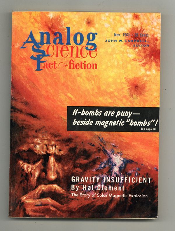 Published Nov 1961 by Dell Magazines.$68.00November 1961. Stories: "Sense of Obligation" (conclusion) by Harry Harrison, "No Small Enemy" by Christopher Anvil, and "Attrition" by Jim Wannamaker. Science fact feature, "Gravity Insufficient" by Hal Clement. Cover by Schoenherr. Illustrations by Krenkel and van Dongen. Softcover, 5.5-in. x 7.5-in.; 178 newsprint pages, B&W. Cover price $0.50.