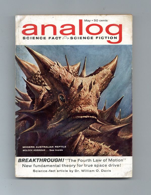 Published May 1962 by Dell Magazines.$10.00May 1962. Stories: "Anything You Can Do" (part 1) by Darrell T. Langart, "Nor Iron Bars" by Jonathan Blake MacKenzie, "The Next Logical Step" by Ben Bova, and "Sight Gag" by Larry M. Harris. Science Fact feature, "The Fourth Law of Motion" by William O. Davis. Cover by Schoenherr. Illustrations by Leone, Schelling, Schoenherr, and perhaps Krenkel. Softcover, 5.5-in. x 7.5-in.; 178 newsprint pages, B&W. Cover price $0.50.