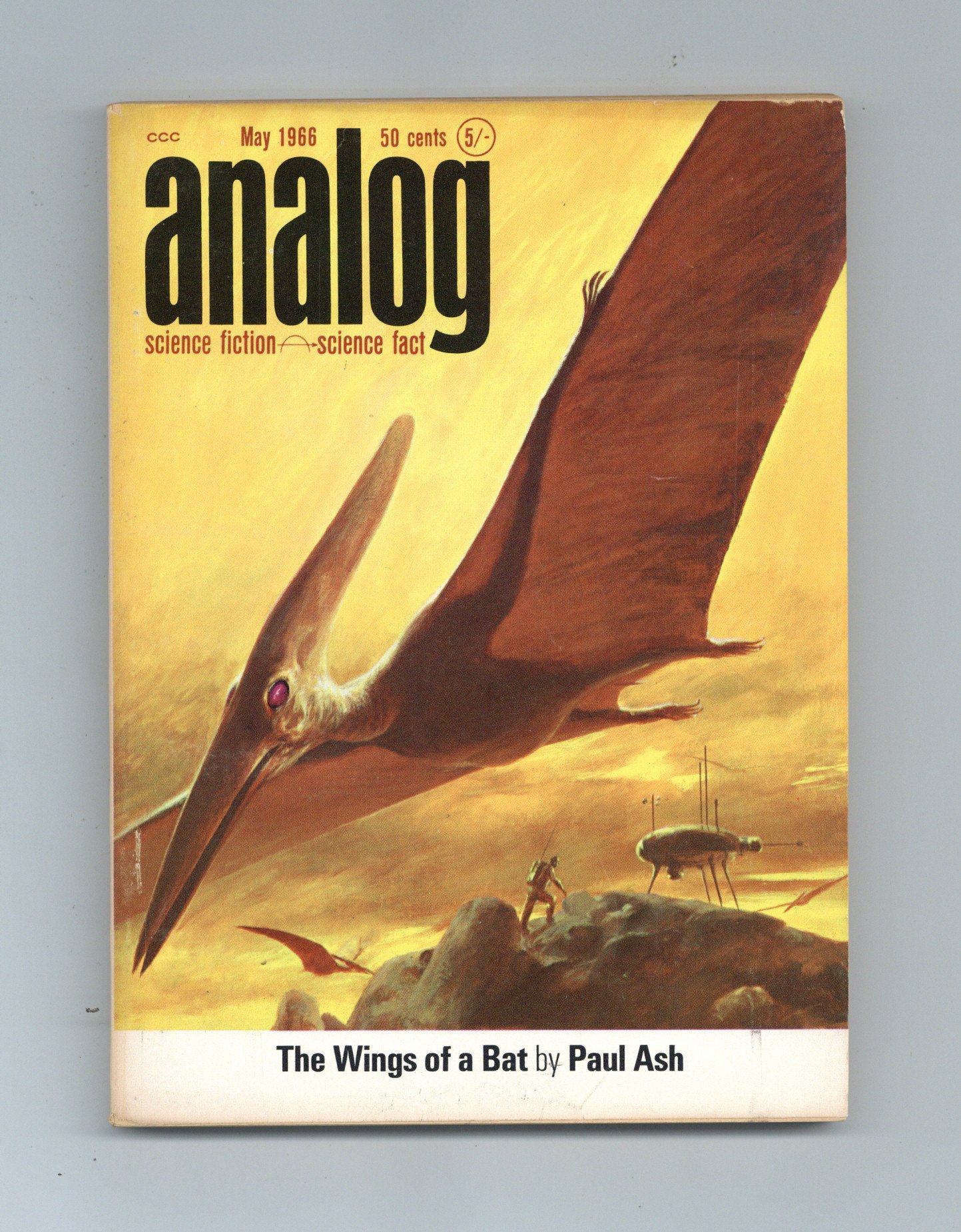 May 1966. Stories: "The Wings of a Bat" by Paul Ash, "The Alchemist" by Charles L. Harness, "Call Him Lord" by Gordon R. Dickson, "Two-Way Communication" by Christopher Anvil, and "Under the Wide and Starry Sky. Science Fact feature, "The Meteorite Miners" by Ralph A. Hall. Cover by John Schoenherr. Illustrations by Kelly Freas, Leo Summers, and John Schoenherr. Softcover, 5.5-in. x 7.5-in.; 162 newsprint pages, B&W. Cover price $0.50.