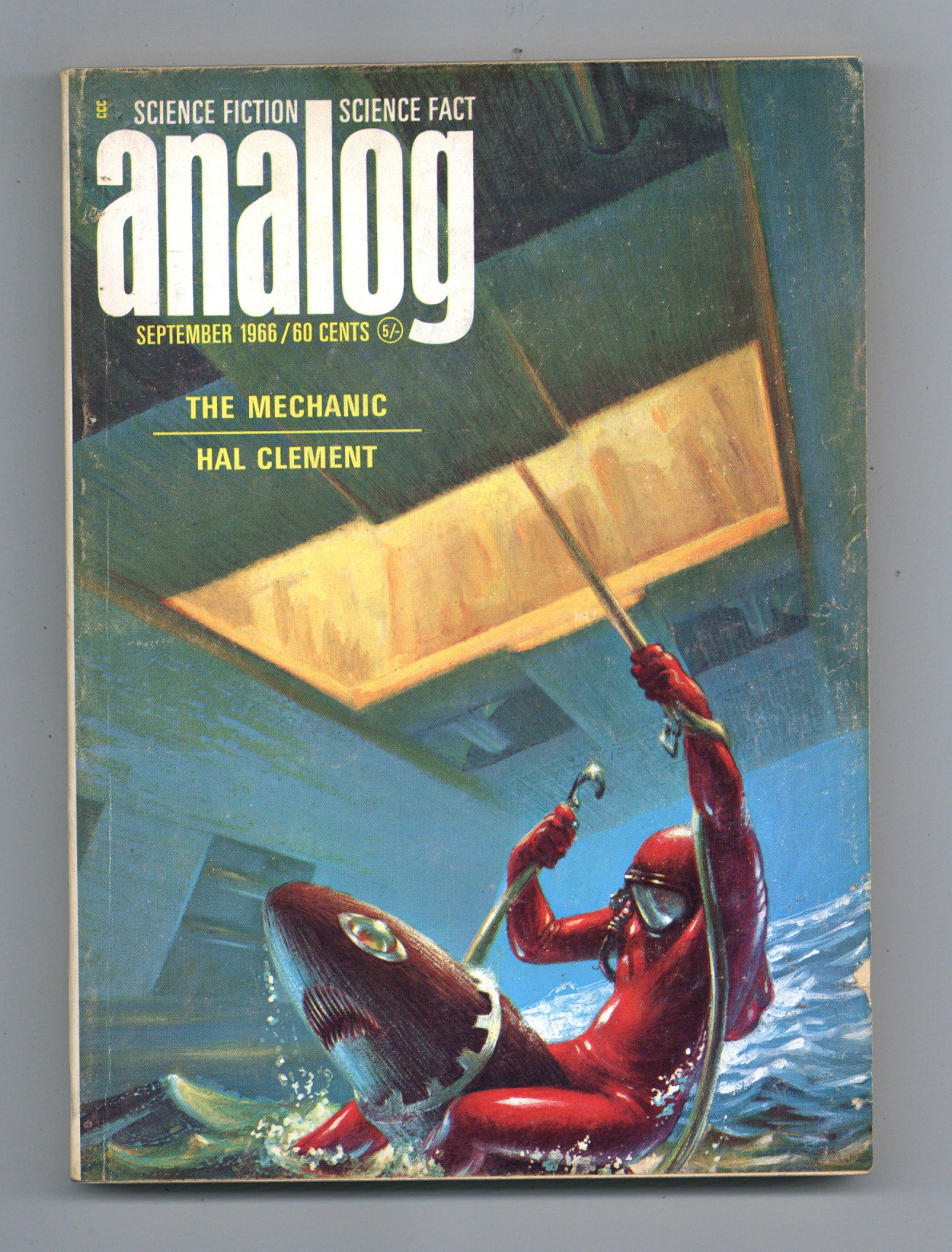 September 1966. Stories: "Too Many Magicians" (part 2) by Randall Garrett, "The Mechanic" by Hal Clement, "Not a Prison Make" by Joseph P. Martino, "A Matter of Reality" by Carole E. Scott, and "Symbols" by Christopher Anvil. Science Fact features, "Challenge: the Insurgent vs. the Counterinsurgent" (part 1) by Joe Poyer. Cover by Kelly Freas. Illustrations by Leo Summers, Kelly Freas and John Schoenherr. Softcover, 5.5-in. x 7.5-in.; 178 newsprint pages, B&W. Cover price $0.60.