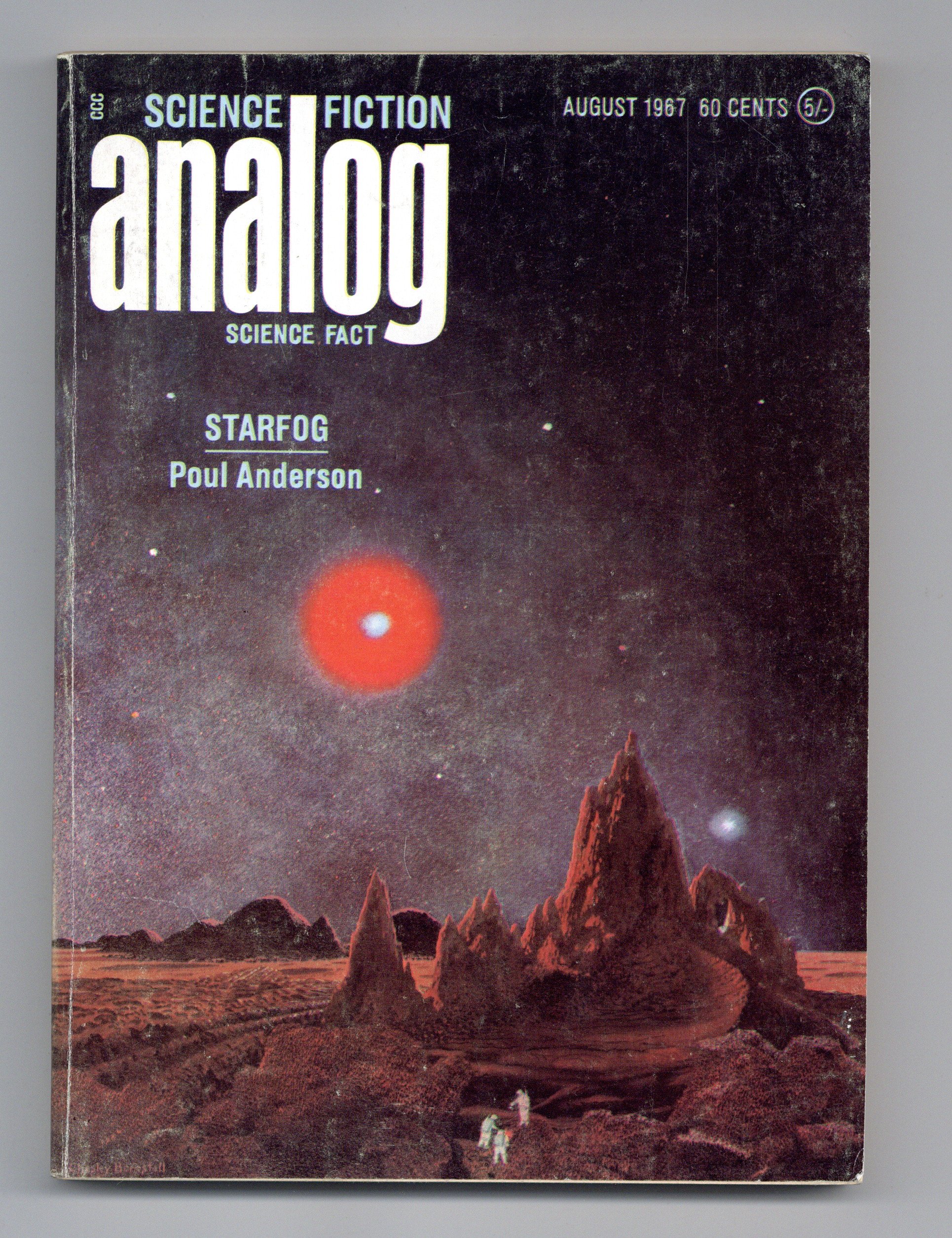 August 1967. Cover by Chesley Bonestell. Stories: "Starfog" by Poul Anderson, "The Featherbedders" by Frank Herbert, "Babel II" by Christopher Anvil, "Cows Can't Eat Grass" by Walt and Leigh Richmond, and "Depression or Bust" by Mack Reynolds. Science Fact article, "The Misers" by William T. Powers. Softcover, 5.5-in. x 7.5-in.; 178 newsprint pages, B&W. Cover price $0.60.