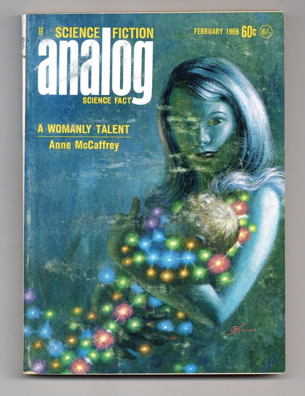 Published Feb 1969 by Dell Magazines.$5.20February 1969. Stories: "Wolfling" (part 2) by Gordon R. Dickson, "A Womanly Talent" by Anne McCaffrey, "You'll Love the Past" by J.R. Pierce, "Extortion, Inc." by Mack Reynolds, and "A Chair of Comparative Leisure" by Robin Scott. Science Fact feature, "The Man Who Makes Planets" by G. Harry Stine. Cover by Kelly Freas. Illustrations by Kelly Freas and Leo Summers. Softcover, 5.5-in. x 7.5-in.; 178 newsprint pages, B&W. Cover price $0.60.