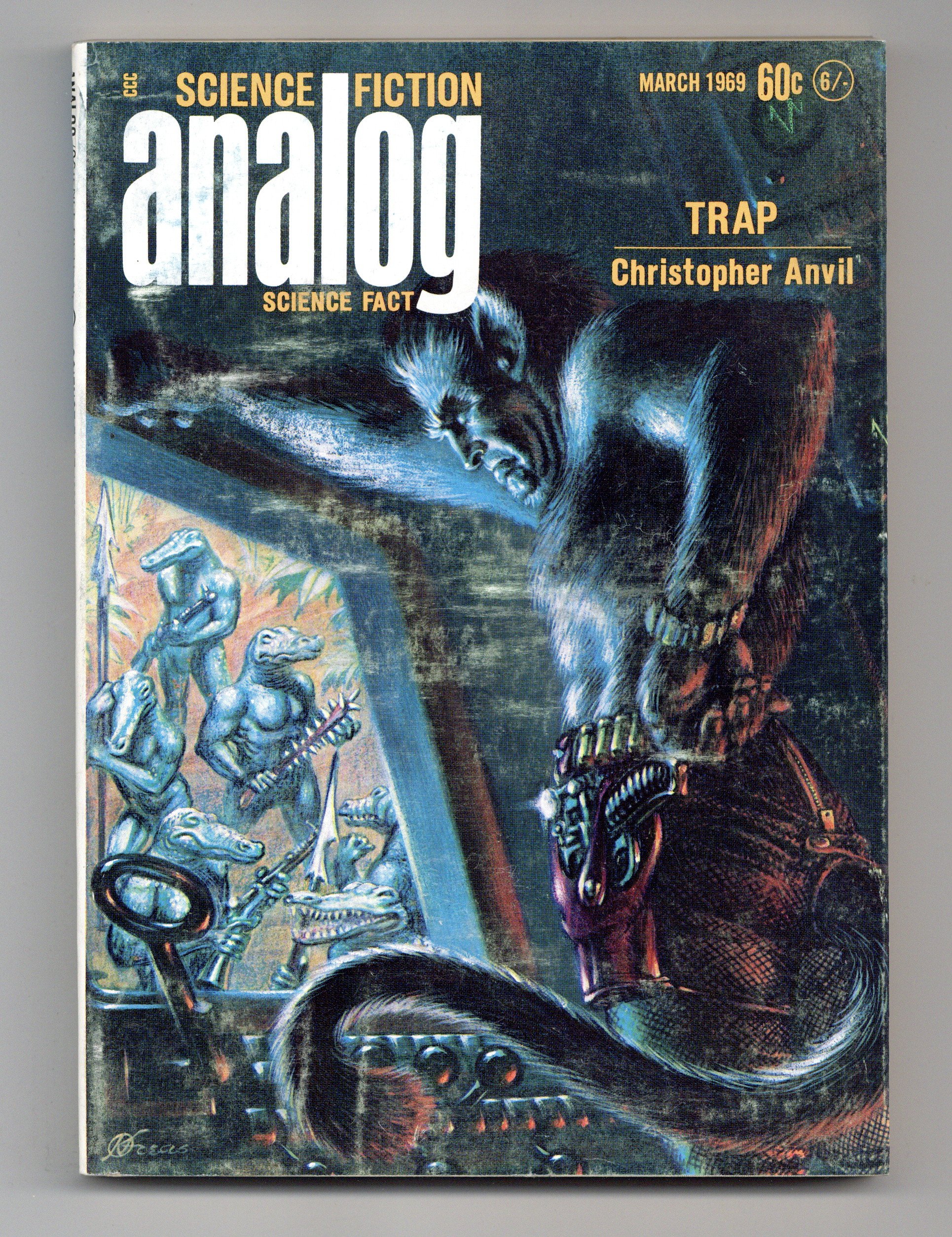 March 1969. Stories: "Wolfling" (conclusion) by Gordon R. Dickson, "Trap" by Christopher Anvil, "Minitalent" by Tak Hallus, "Mirror, Mirror, On the Wall" by R.E. Allen, and "From Fanaticism, or for Reward" by Harry Harrison. Science Fact feature, "They're Trying to Tell Us Something" (part 1) by Thomas R. McDonough. Cover by Kelly Freas. Illustrations by Kelly Freas and Leo Summers. Softcover, 5.5-in. x 7.5-in.; 178 newsprint pages, B&W. Cover price $0.60.
