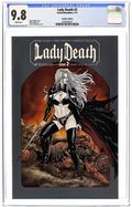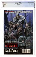 Auxiliary Cover by Richard Ortiz. Limited to 1500 copies. (W) Brian Pulido, Mike Wolfer (A) Marcelo Mueller (C) Garrie Gastonny, Juan Jose Ryp Lady Death is back in an all-new, on-going monthly series! The most popular femme fatale in comics returns with a vicious new tale that delivers for both new and old readers! Lady Death's quest to recover her stolen powers takes her to the shifting and treacherous sands of the Middle East, where monstrous, stinging death awaits her in the Temple of Akrab! Guided by inner visions, Illadra has made her way to the desert, where any number of a dozen fates worse than death can befall the voluptuous thief if she makes one misstep. But even if she makes it across the burning expanse to her goal, will she survive against the guardians of the first shard of her power, creatures warped and corrupted by the very evil which emanates from the piece of Lady Death's lost soul which she hopes to ensnare? Co-written by Mike (Gravel, Wolfskin) Wolfer and original creator Brian Pulido, this series promises to be the most powerful Lady Death tale ever! Cover price $3.99.