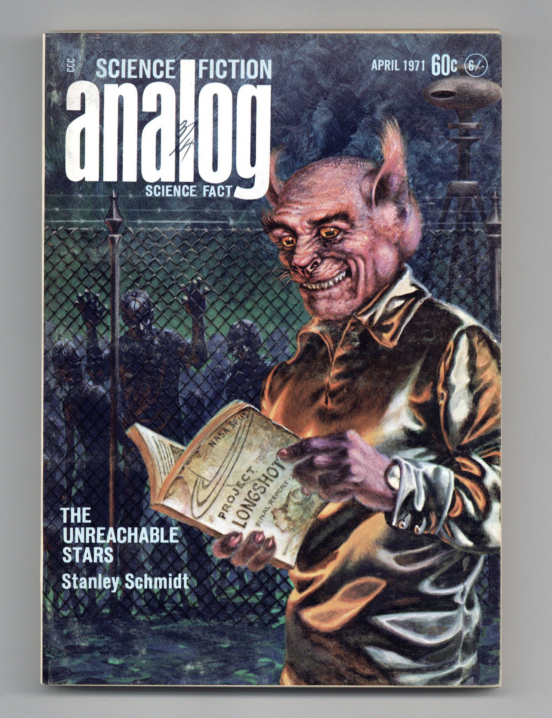 April 1971. Stories: "The World Menders" (conclusion) by Lloyd Biggle Jr., "The Unreachable Stars" by Stanley Schmidt, "Heart's Desire and Other Simple Wants" by W. Macfarlane, and "Higher Centers" by F. Paul Wilson. Science Fact article, "Real Science for Real Problems" by John R. Pierce. Cover by Kelly Freas. Illustrations by Kelly Freas and Vincent diFate. Softcover, 5.5-in. x 7.5-in.; 178 newsprint pages, B&W. Cover price $0.60.