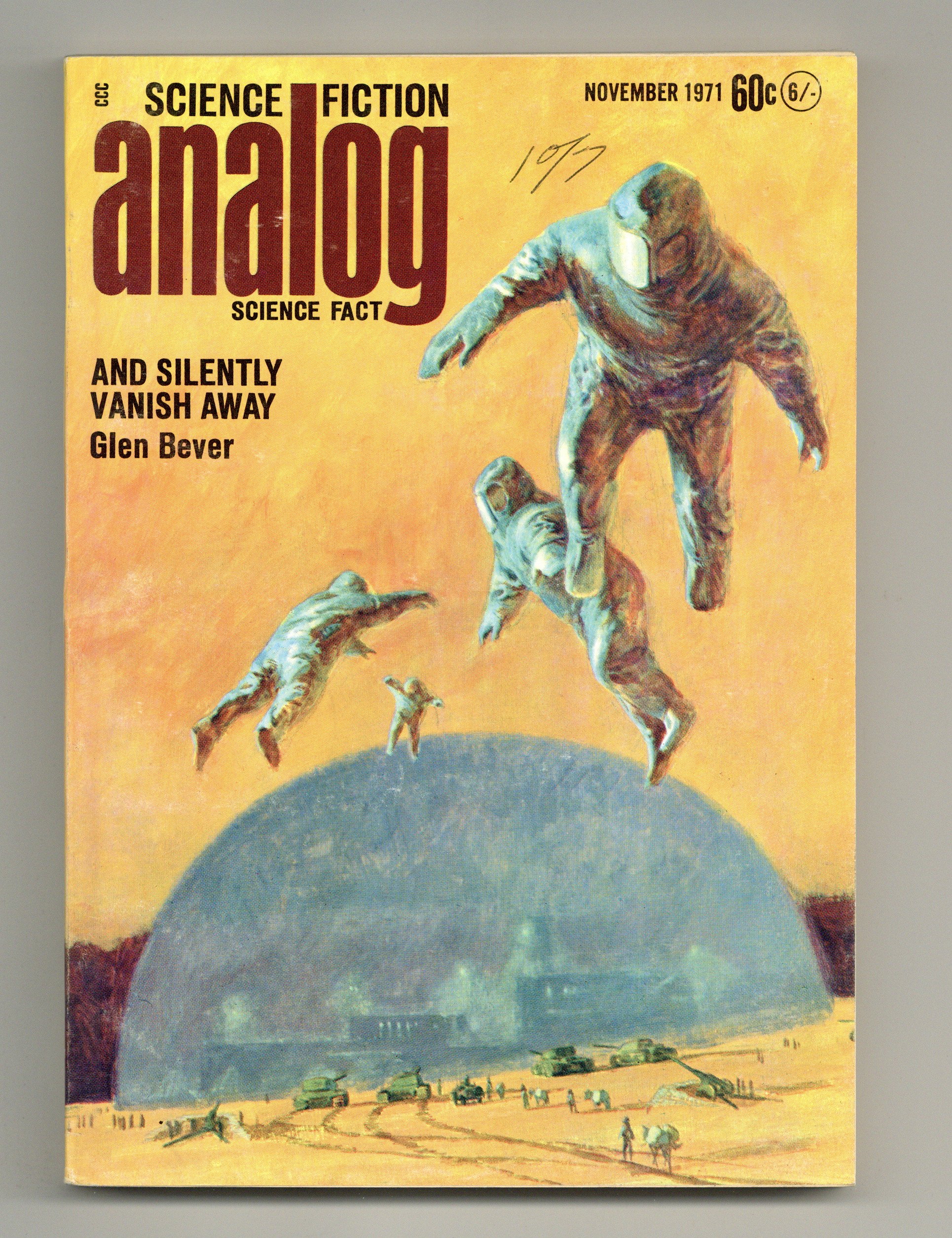 Published Nov 1971 by Dell Magazines.$3.70November 1971. Cover by John Schoenherr. Stories: "Hierarchies" (conclusion) by John T. Phillifent, "And Silently Vanish Away" by Glen Bever, "The Old Man of Ondine" by Terrence MacKann, "Compulsion Worse Confounded" by Robert Chilson, "Holding Action" by Andrew M. Stephenson, and "The Nothing Venireman One" by W. Macfarlane. Science Fact article, "In Quest of a Humanlike Robot" by Margaret L. Silbar. Illustrations by John Schoenherr, Kelly Freas, and Leo Summers. Softcover, 5.5-in. x 7.5-in.; 178 newsprint pages, B&W. Cover price $0.60.