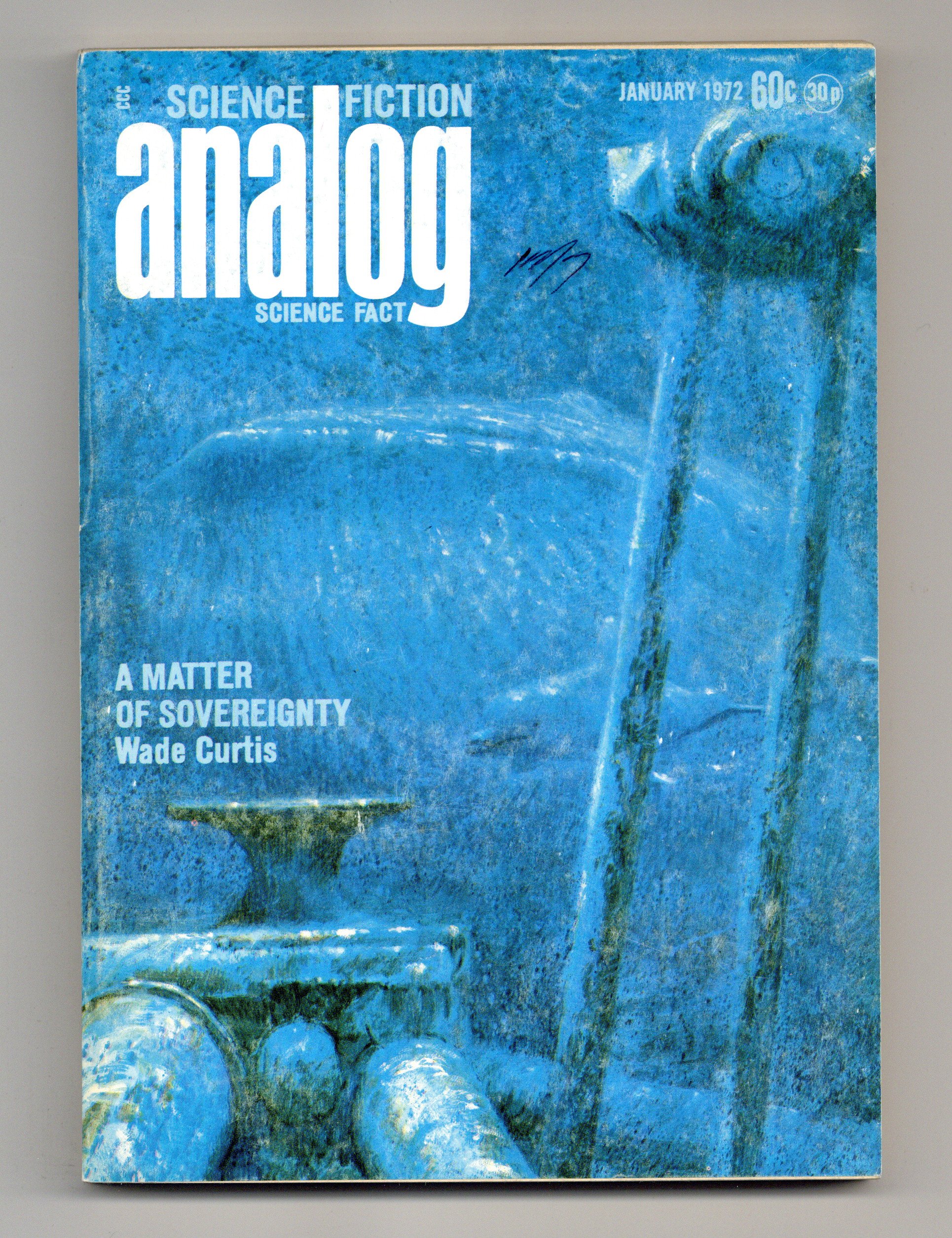 Published Jan 1972 by Dell Magazines.$2.50January 1972. Stories: "A Spaceship for the King" (part 2) by Jerry Pournelle, "A Matter of Sovereignty" by Wade Curtis, "Riddle Me This" by Christopher Anvil, "Truck Driver" by Robert Chilson, "The Greatest Asset" by Isaac Asimov, and "Stormy Bellwether" by Jack Wodhams. Science Fact article, "Galactic Geopolitics" by Ben Bova. Cover by John Schoenherr. Illustrations by John Schoenherr, Kelly Freas, and Leo Summers. Softcover, 5.5-in. x 7.5-in.; 178 newsprint pages, B&W. Cover price $0.60.