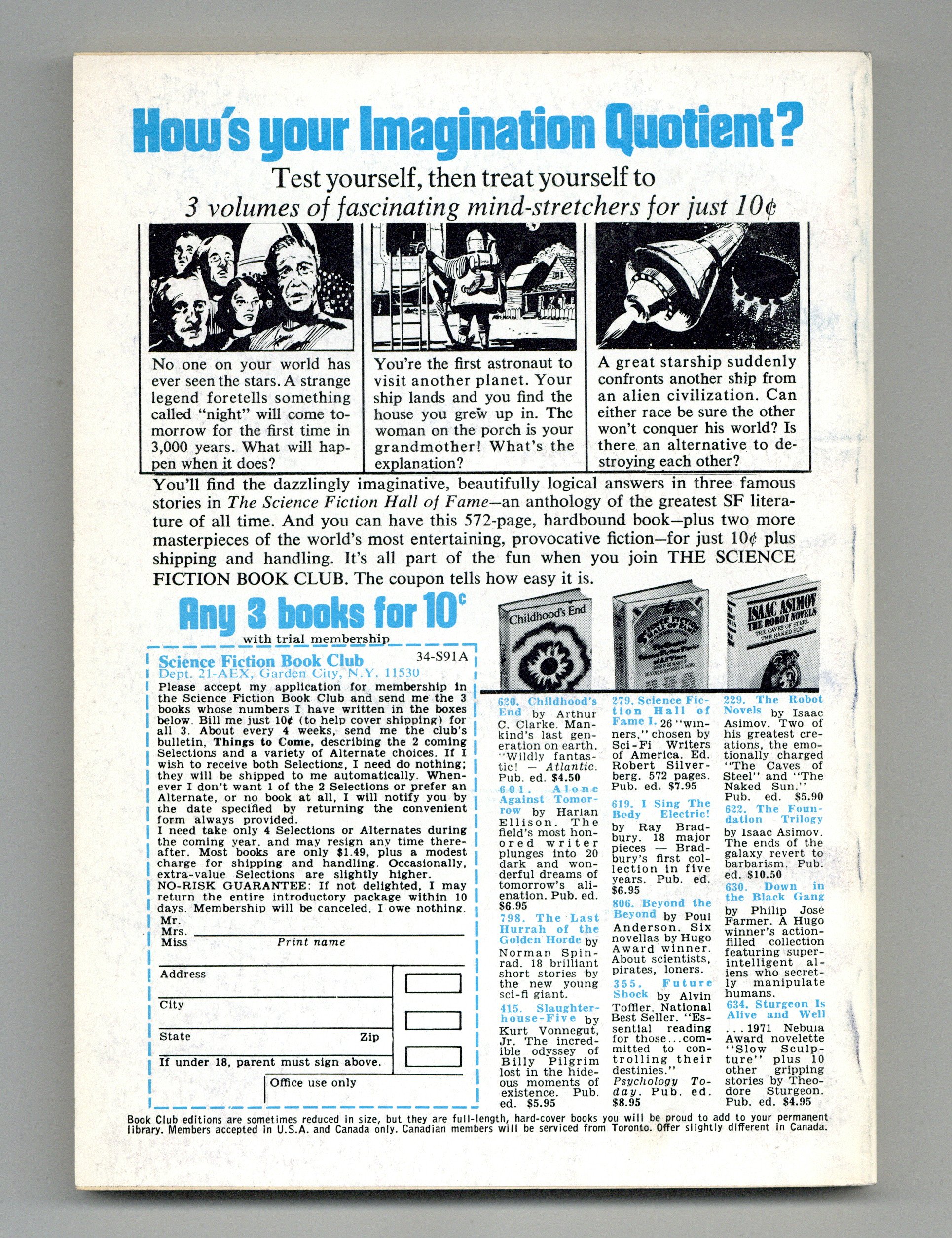January 1972. Stories: "A Spaceship for the King" (part 2) by Jerry Pournelle, "A Matter of Sovereignty" by Wade Curtis, "Riddle Me This" by Christopher Anvil, "Truck Driver" by Robert Chilson, "The Greatest Asset" by Isaac Asimov, and "Stormy Bellwether" by Jack Wodhams. Science Fact article, "Galactic Geopolitics" by Ben Bova. Cover by John Schoenherr. Illustrations by John Schoenherr, Kelly Freas, and Leo Summers. Softcover, 5.5-in. x 7.5-in.; 178 newsprint pages, B&W. Cover price $0.60.