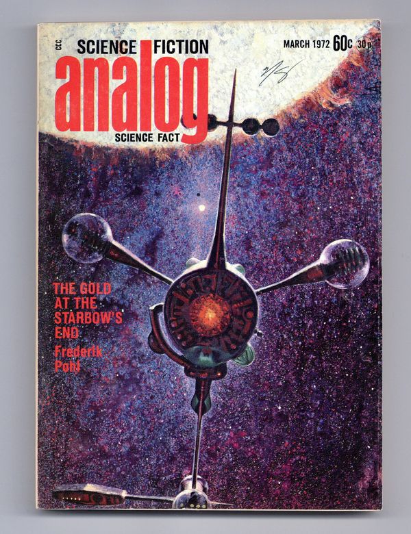 Published Mar 1972 by Dell Magazines.$3.20March 1972. Cover by John Schoenherr. Stories: "The Gold at the Starbow's End" by Frederik Pohl, "Cloak of Anarchy" by Larry Niven, "Child of the Gods" by James Schmitz, "War in Our Time" by Howard L. Myers, "The Long Silence" by Donald Noakes, and "BCL 362" by Vernon Glasser. Science Fact article: "Skylab" (part 1 of 2) by Joseph Green. Illustrations by John Schoenherr, Vincent DiFate, Jack Gaughan, Leo Summers, and Kelly Freas. Softcover, 5.5-in. x 7.5-in.; 178 newsprint pages, B&W. Cover price $0.60.