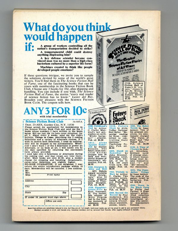 March 1972. Cover by John Schoenherr. Stories: "The Gold at the Starbow's End" by Frederik Pohl, "Cloak of Anarchy" by Larry Niven, "Child of the Gods" by James Schmitz, "War in Our Time" by Howard L. Myers, "The Long Silence" by Donald Noakes, and "BCL 362" by Vernon Glasser. Science Fact article: "Skylab" (part 1 of 2) by Joseph Green. Illustrations by John Schoenherr, Vincent DiFate, Jack Gaughan, Leo Summers, and Kelly Freas. Softcover, 5.5-in. x 7.5-in.; 178 newsprint pages, B&W. Cover price $0.60.