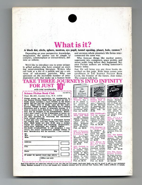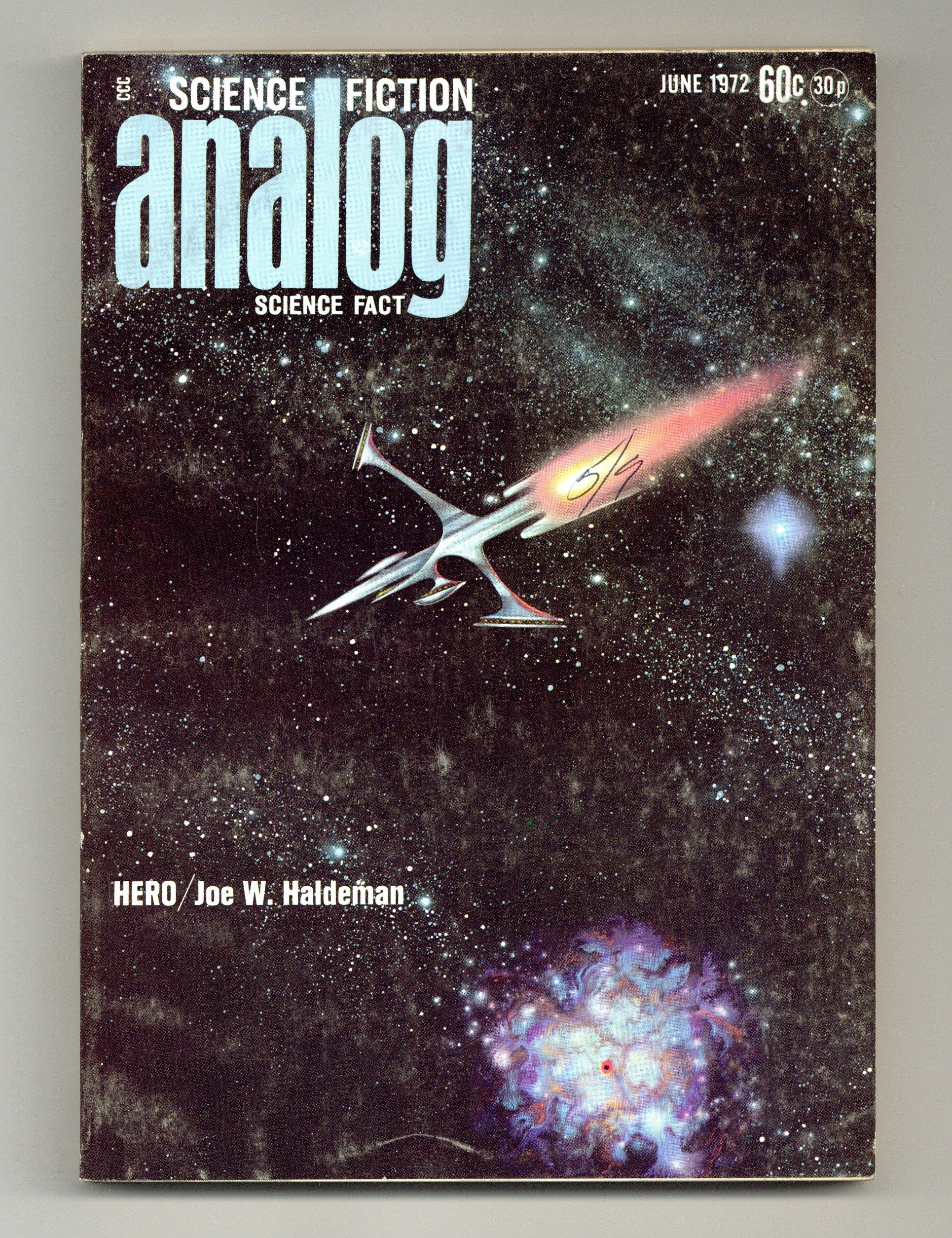 Published Jun 1972 by Dell Magazines.$6.00June 1972. Stories: "A Transatlantic Tunnel, Hurrah!" (conclusion) by Harry Harrison, "Hero" by Joe W. Haldeman, "The Darkness to Come" by Robert B. Marcus Jr., "Klysterman's Silent Violin" by Michael Rogers, and "Out, Wit!" by Howard L. Myers. Science Fact article, "Strong Poison 2" by Carl A. Larson. Short review of Ursula K. Le Guin's "The Lathe of Heaven." Cover by Kelly Freas. Illustrations by Leo Summers, John Schoenherr, and Kelly Freas. Softcover, 5.5-in. x 7.5-in.; 178 newsprint pages, B&W. Cover price $0.60.