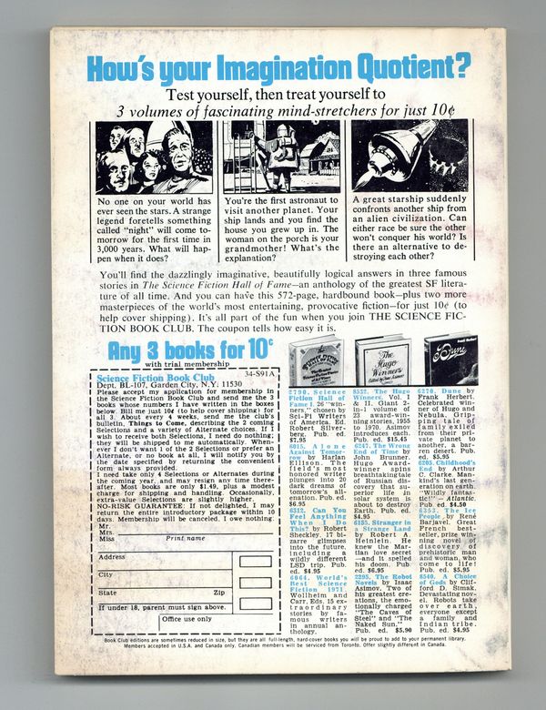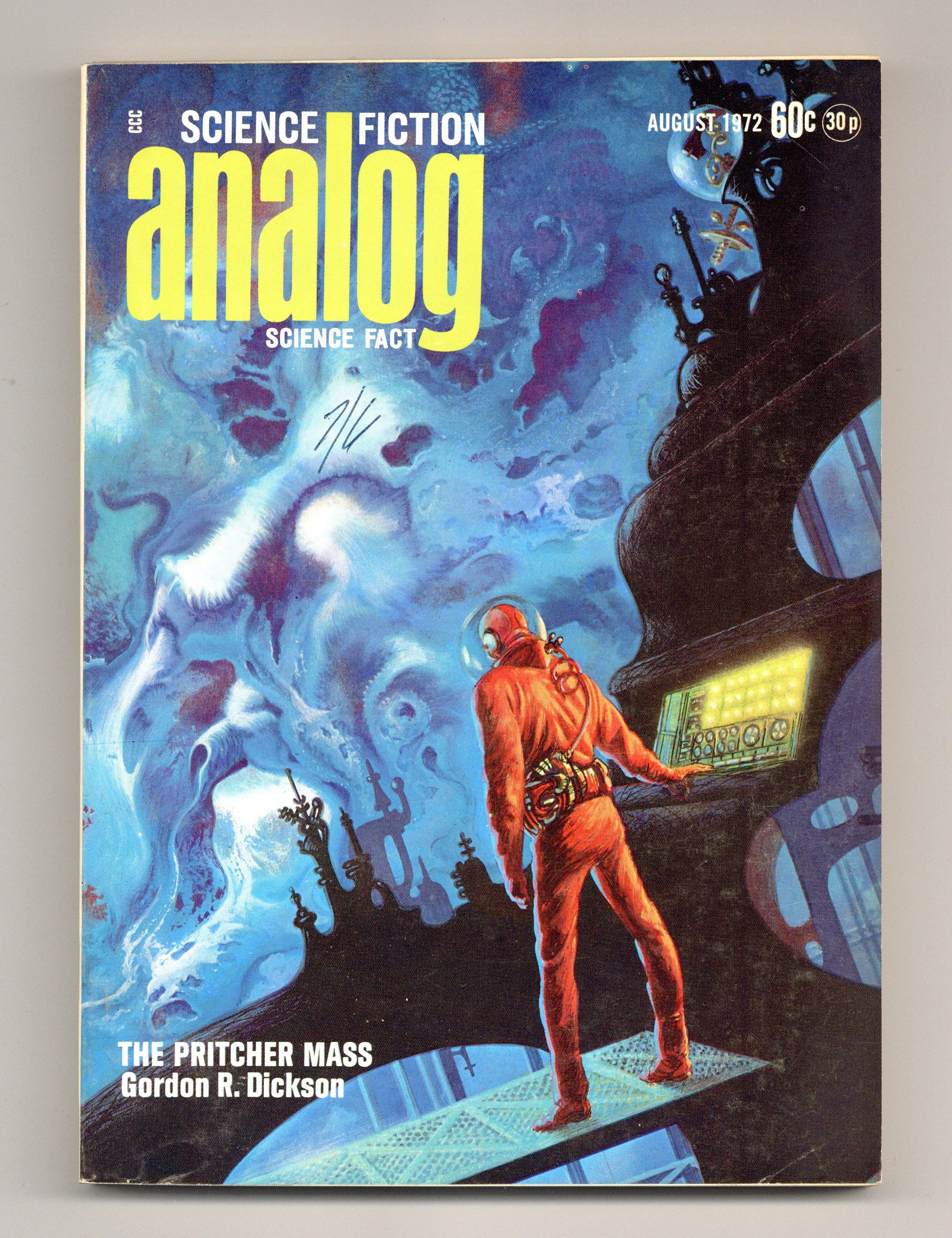 Published Aug 1972 by Dell Magazines.$6.00August 1972. Stories: "The Pritcher Mass" (part 1) by Gordon R. Dickson, "Nanda" by Gary Alan Ruse, "Budnip" by Jack Wodhams, "Power to the People" by Wade Curtis, "Three-Tour Man" Joseph Green, and "Long Shot" by Vernor Vinge. Science Fact article, "The Computer was a Fish" by George R.R. Martin. Cover by Kelly Freas. Illustrations by Leo Summers, John Schoenherr, Jack Gaughan, and Kelly Freas. Softcover, 5.5-in. x 7.5-in.; 178 newsprint pages, B&W. Cover price $0.60.