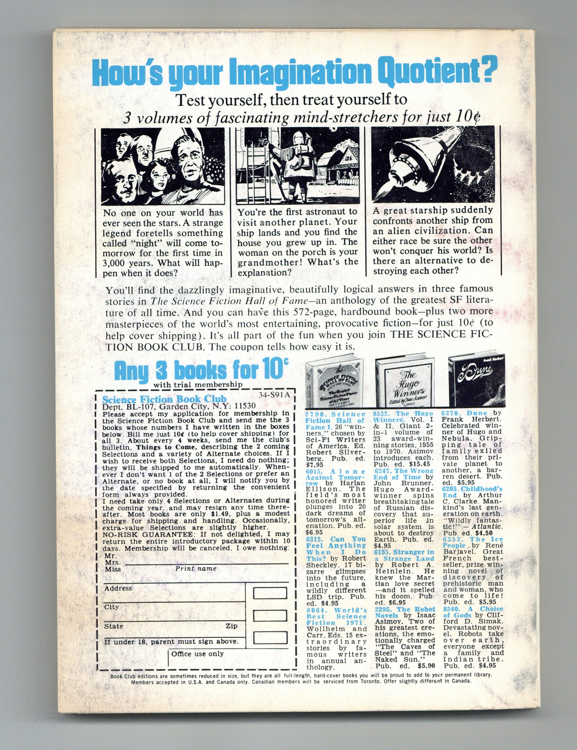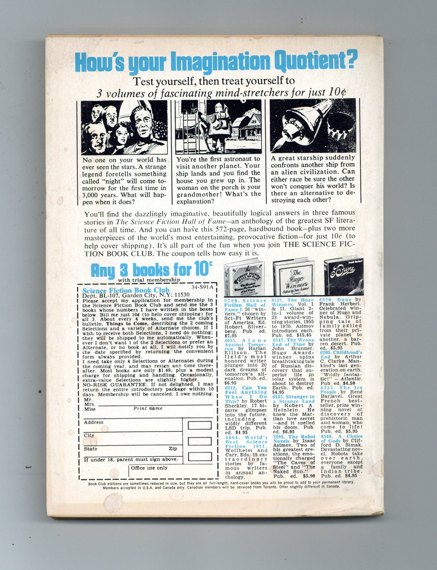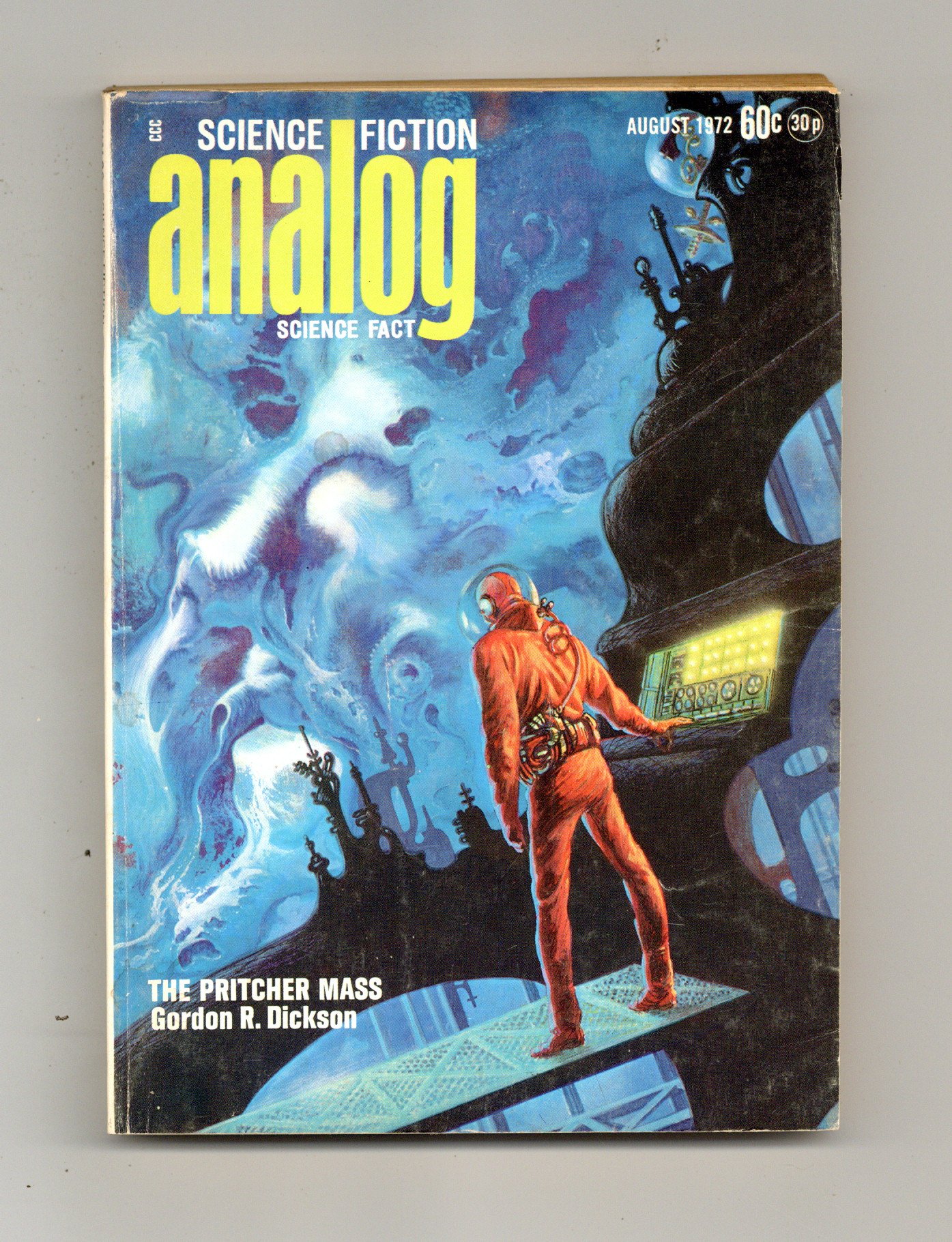 August 1972. Stories: "The Pritcher Mass" (part 1) by Gordon R. Dickson, "Nanda" by Gary Alan Ruse, "Budnip" by Jack Wodhams, "Power to the People" by Wade Curtis, "Three-Tour Man" Joseph Green, and "Long Shot" by Vernor Vinge. Science Fact article, "The Computer was a Fish" by George R.R. Martin. Cover by Kelly Freas. Illustrations by Leo Summers, John Schoenherr, Jack Gaughan, and Kelly Freas. Softcover, 5.5-in. x 7.5-in.; 178 newsprint pages, B&W. Cover price $0.60.