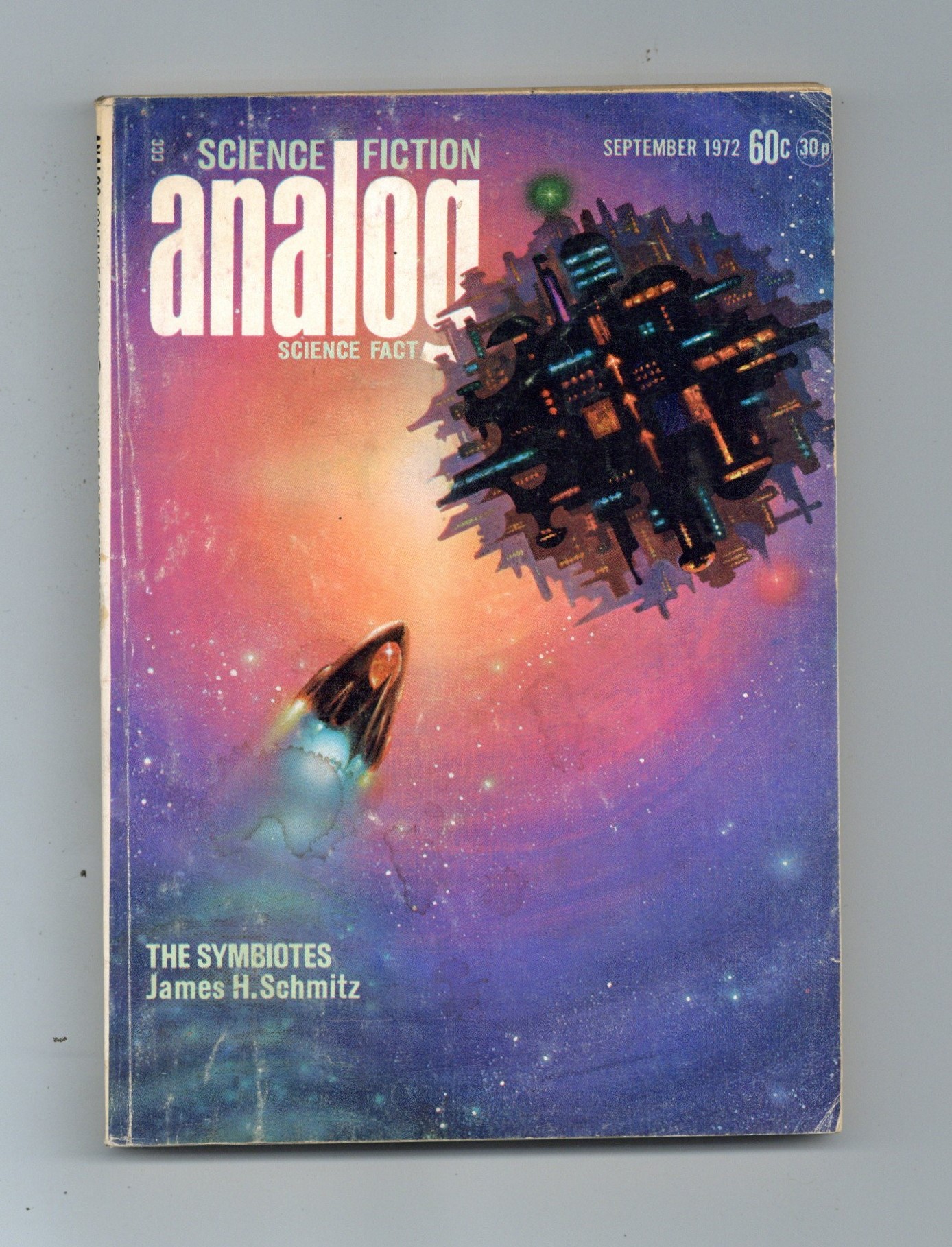 September 1972. Stories: "The Pritcher Mass" (part 2) by Gordon R. Dickson, "The Symbiotes" by James H. Schmitz, "Ideological Defeat" by Christopher Anvil, "The Hated Dreams" by John Strausbaugh, "Generation Gaps" by Clancy O'Brien, and "The War of the Words" by Rick Conley. Science Fact articles, "The Iron Pillar of Delhi" by L. Sprague de Camp and "How to Design a Flying Saucer" by Richard J. Rosa. Short review of Michael Crichton's "The Terminal Man." Cover by Kelly Freas. Illustrations by Leo Summers, Vincent diFate, Gray Morrow, and Kelly Freas. 5.5-in. x 7.5-in.; black and white; 176 newsprint pages. Cover price $0.60.