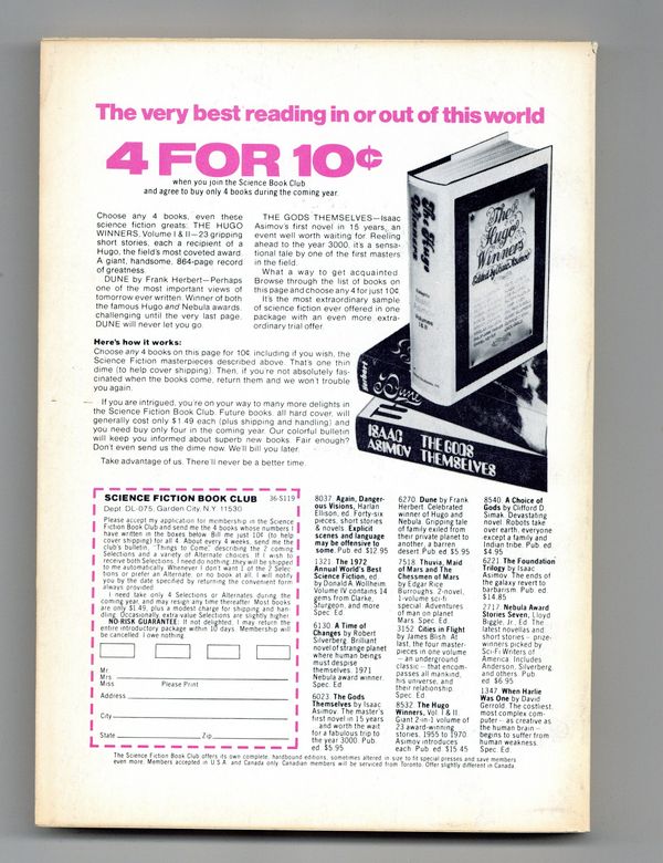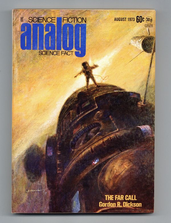 August 1973. Stories: "The Far Call" (part 1) by Gordon R. Dickson, "Forty Days and Nights" by Robert Chilson, "The Epoxy Goat" by David Lewis, "Stimulus-Reward Situation" by Gene Fisher, "The Sweet Smell of the Past" by Lawrence Perkins, and "The Jungle" by Karl Hudgins. Science Fact article, "The Synchronistic Barometer" by Herbie Brennan. Cover by John Schoenherr. Illustrations by John Schoenherr, Vincent diFate, Mike Hinge, and Leo Summers. Softcover, 5.5-in. x 7.5-in.; 178 newsprint pages, B&W. Cover price $0.60.