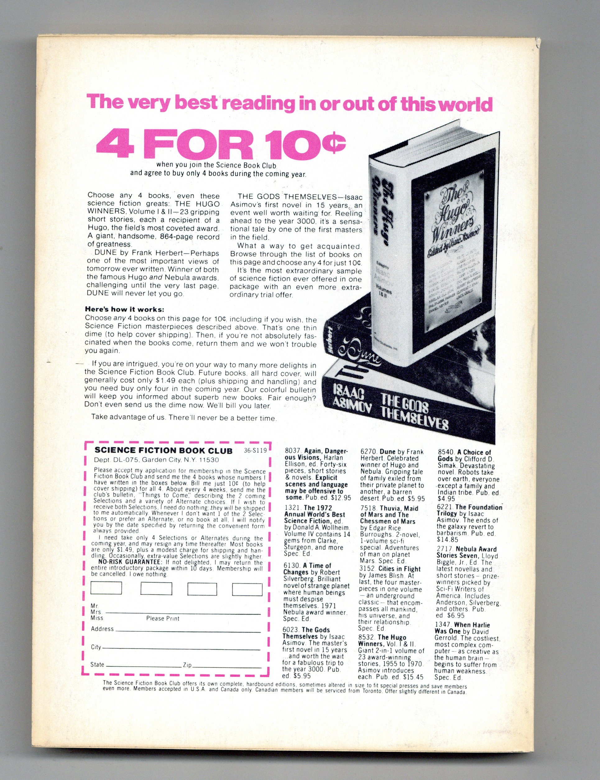 Published Aug 1973 by Dell Magazines.$30.00August 1973. Stories: "The Far Call" (part 1) by Gordon R. Dickson, "Forty Days and Nights" by Robert Chilson, "The Epoxy Goat" by David Lewis, "Stimulus-Reward Situation" by Gene Fisher, "The Sweet Smell of the Past" by Lawrence Perkins, and "The Jungle" by Karl Hudgins. Science Fact article, "The Synchronistic Barometer" by Herbie Brennan. Cover by John Schoenherr. Illustrations by John Schoenherr, Vincent diFate, Mike Hinge, and Leo Summers. Softcover, 5.5-in. x 7.5-in.; 178 newsprint pages, B&W. Cover price $0.60.