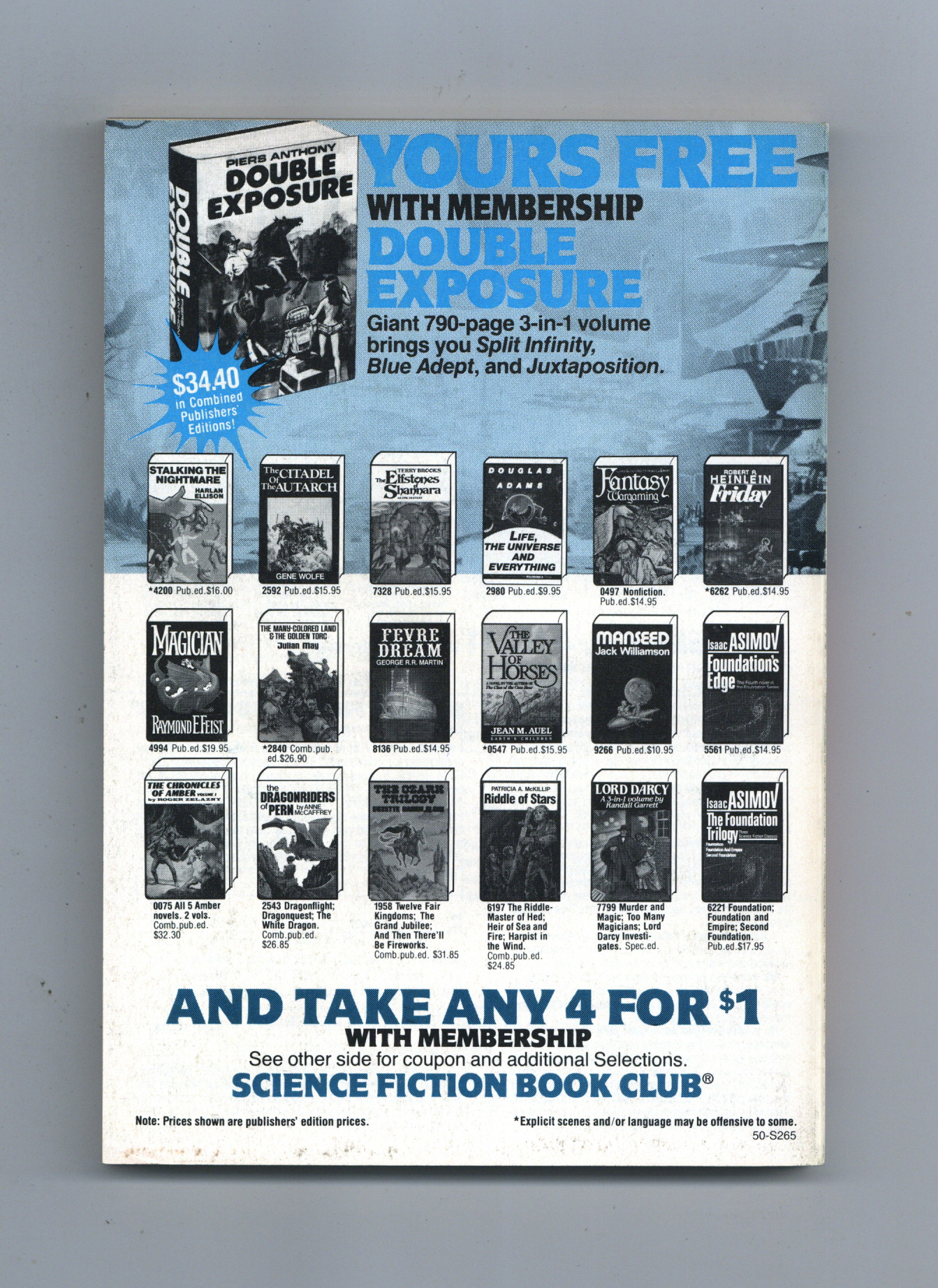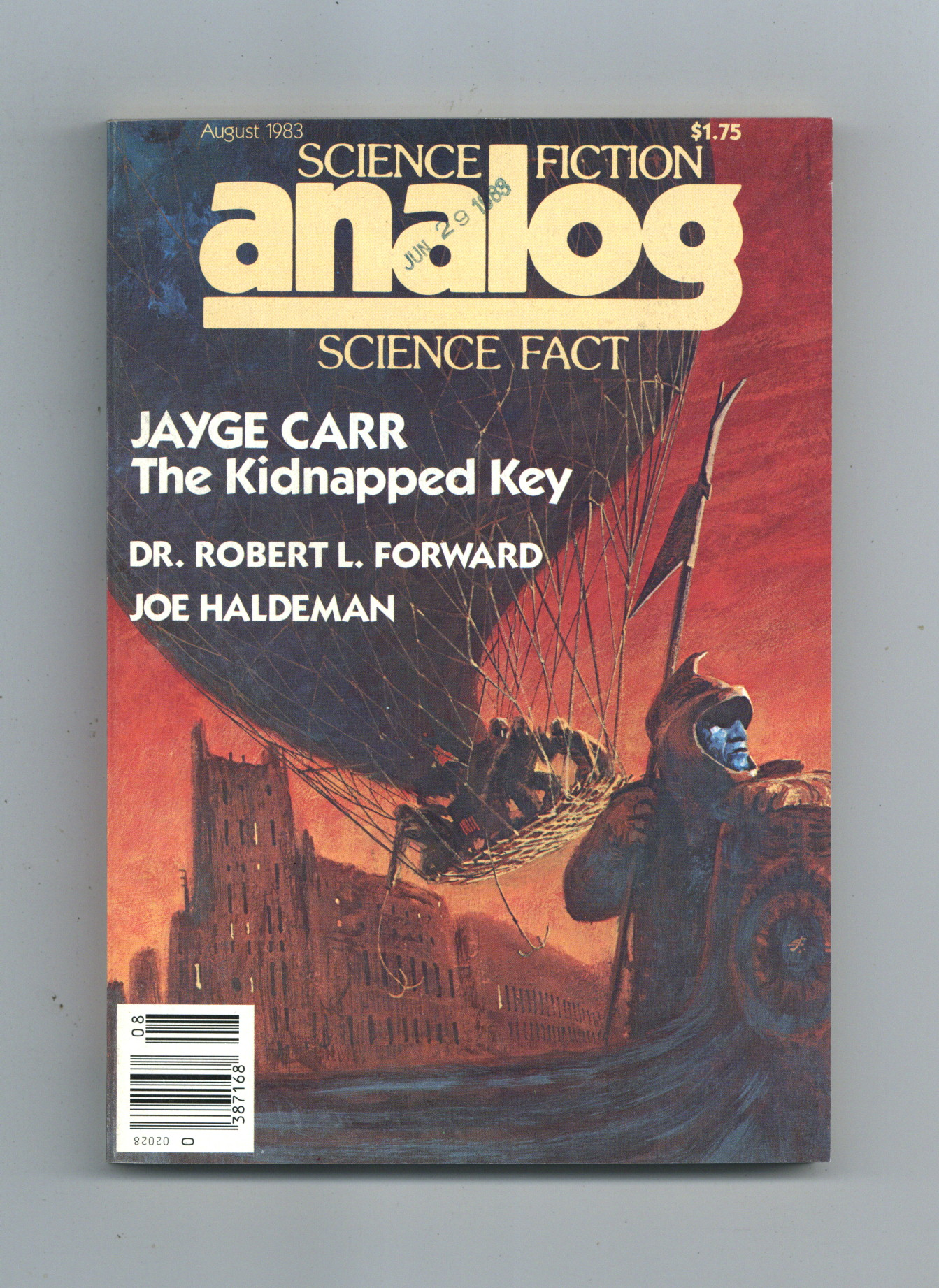 Published Aug 1983 by Dell Magazines.$7.00August 1983. Stories: "Credos" by Ray Brown, "The Kidnapped Key" by Jayge Carr, "The Leaves of October" by Don Sakers, "The Geometry of Narrative" by Hilbert Schenck, "Twin Paradox" by Dr. Robert L. Forward, and "Blue Sky" by Eric Vinicoff. Science Fact article, "'Intelligent' Planetary Probes" by Stephen A. Kallis Jr. Cover by John Schoenherr. Illustrations by Val Lakey, Doug Beekman, Janet Aulisio, Richard Crist, Gary Freeman, and Jack Gaughan. Softcover, 5.5-in. x 7.5-in.; 178 newsprint pages, B&W. Cover price $1.75.