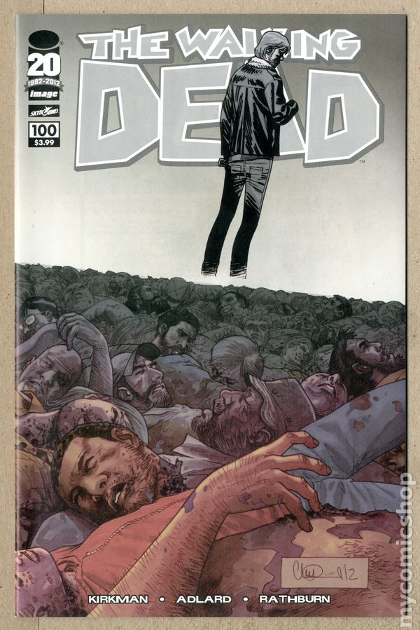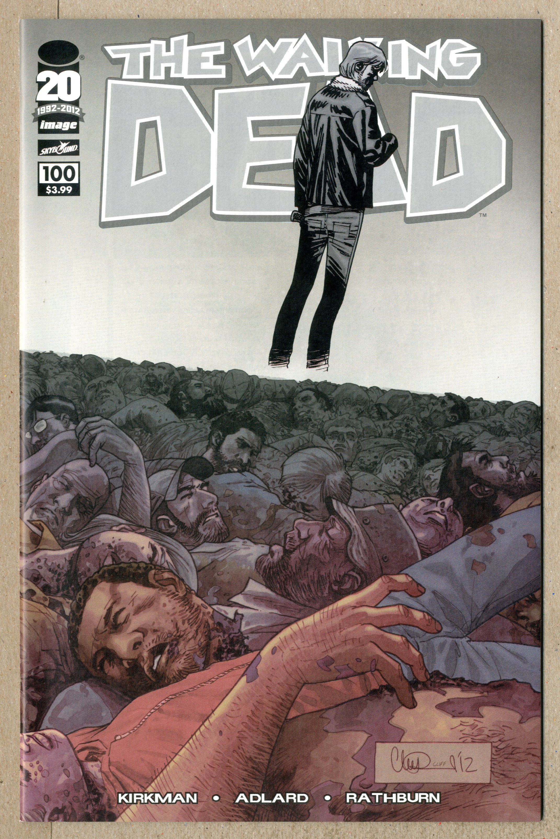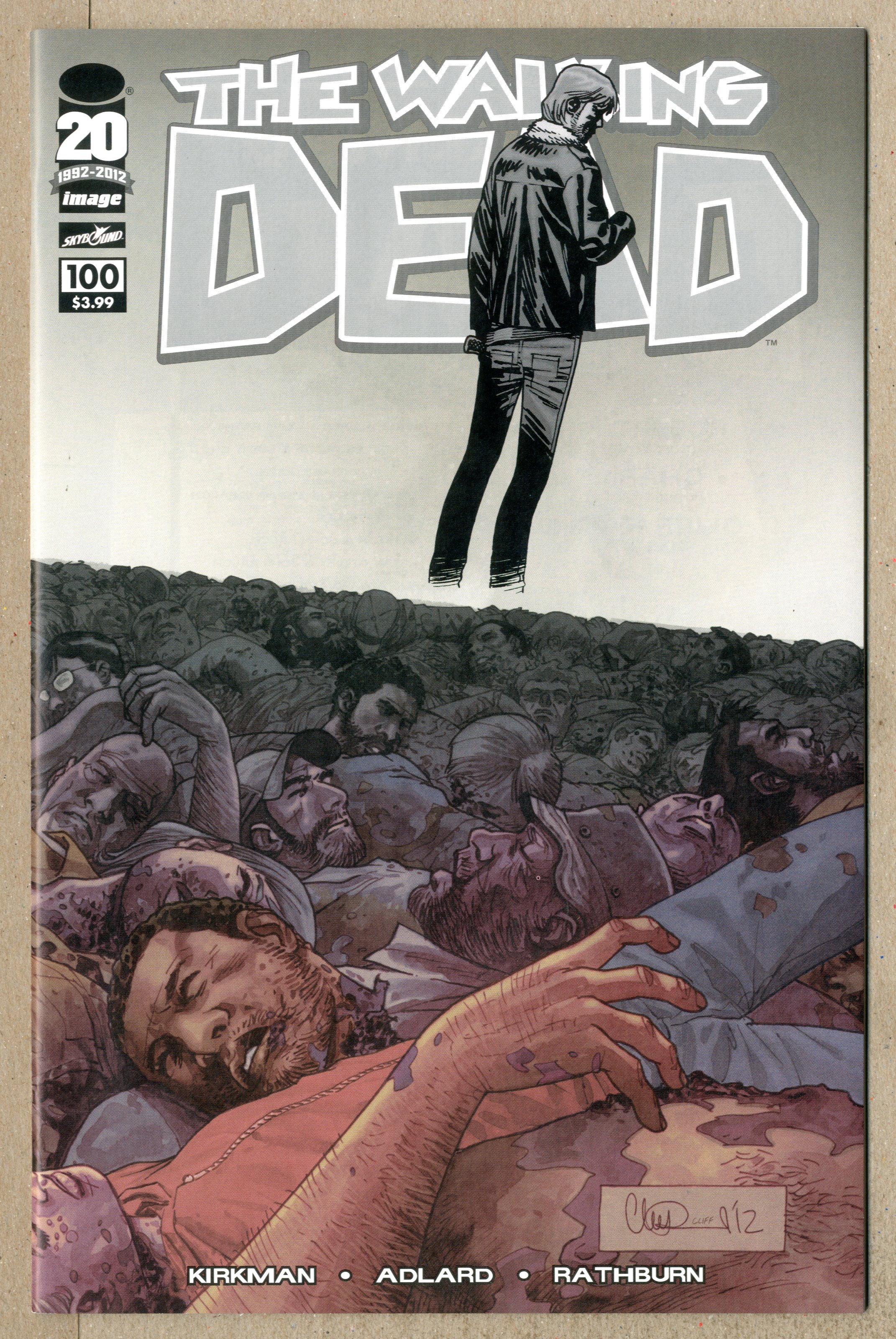 Wraparound Cover by Charlie Adlard Something to Fear: Part 4 of 6 - (W) Robert Kirkman (A) Charlie Adlard, Cliff Rathburn 'SOMETHING TO FEAR' CONTINUES! This extra-sized chapter contains one of the darkest moments in Rick Grimes' life, and one of the most violent and brutal things to happen within the pages of this series. 100 issues later, this series remains just as relentless as the debut issue. Do not miss the monumental 100th issue of THE WALKING DEAD! NOTE: 1st Appearance of of Negan & Lucille. Cover price $3.99.
