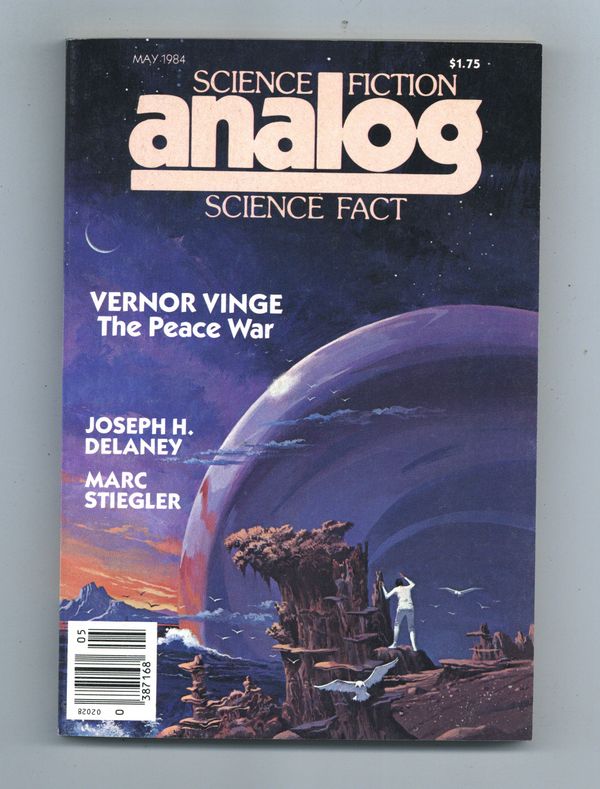 Published May 1984 by Dell Magazines.$12.00May 1984. Stories: "The Peace War" (part 1) by Vernor Vinge, "Valentina" by Joseph H. Delaney and Marc Stiegler, "Low Midnight" by Alson Tellure, "Death or Glory" by W.T. Quick, and "Born Again" by Ben Bova. Science Fact article, "The Deadly Thing at 2.4 Kilo-Parsecs" by David Brin. Cover by Vincent Di Fate. Illustrations by H.R. Van Dongen, Jack Gaughan, and Gary Freeman. Softcover, 5.5-in. x 7.5-in.; 178 newsprint pages, B&W. Cover price $1.75.