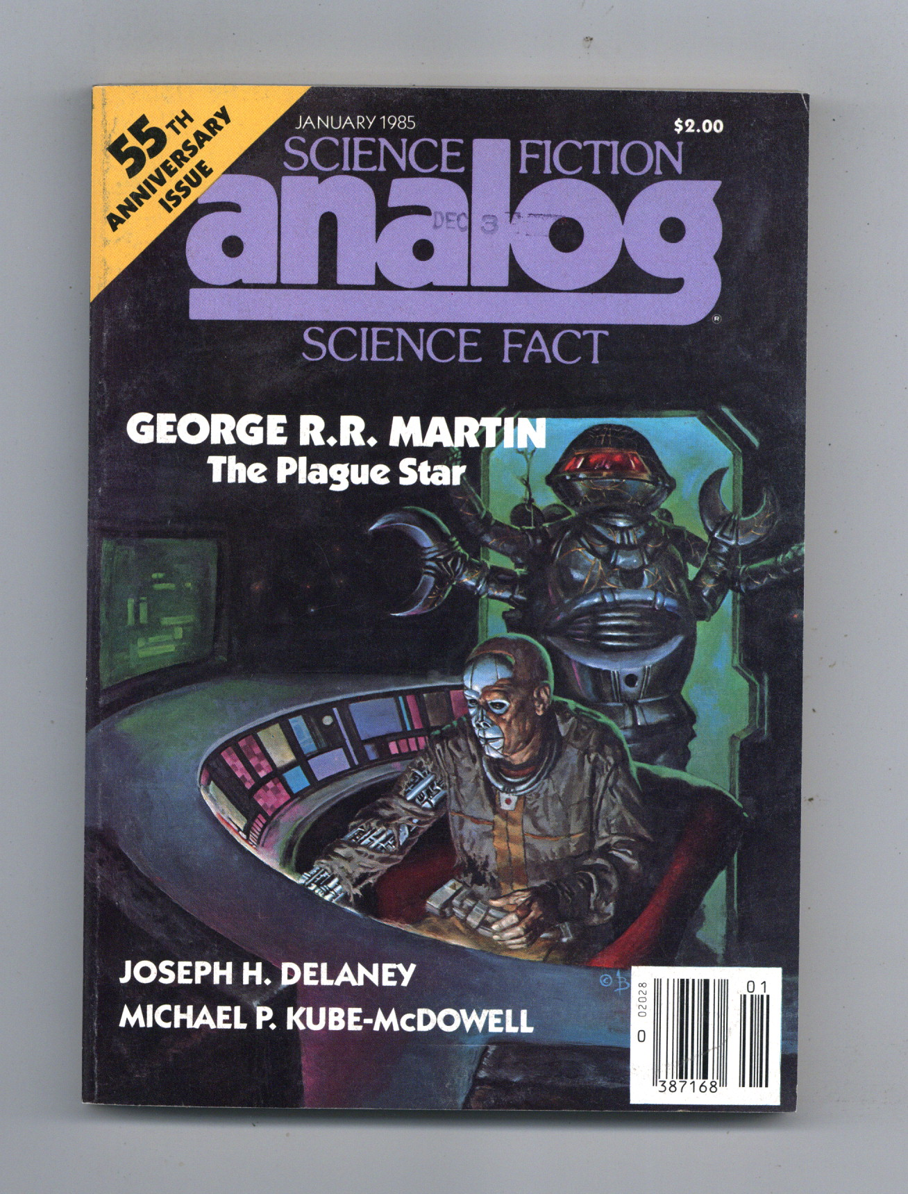 Published Jan 1985 by Dell Magazines.$4.20January 1985. Stories: "The Plague Star" (part 1) by George R.R. Martin, "Painkillers" by Joseph H. Delaney, "The Singing of the Bestry, and Praying for the Sky" by Rick Shelley, "Cycles" by Don Sakers, "A Touch Beyond" by Stephen L. Burns, and "Lifebomb" by Michael P. Kube-McDowell. Science Fact article, "Biofeedback in Space" by Walter B. Hendrickson Jr. Cover by Doug Beekman. Illustrations by Doug Beekman, Jack Gaughan, Judith Mitchell, Nicholas Jainschigg, Tom Kidd, and Robert Walters. Softcover, 5.5-in. x 7.5-in.; 194 newsprint pages, B&W. Cover price $2.00.