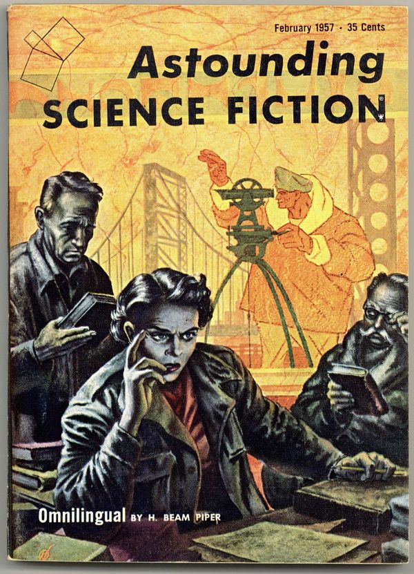 February 1957 - Volume 58, Issue 6 - 1st printing. Science fiction stories: "Omnilingual" by H. Beam Piper, "Unlucky Chance" by M.C. Pease, "The Man With the Corkscrew Mind" by Stanley Mullen, "The War Is Over" by Algis Budrys and "Get Out of My Sky"(Conclusion) by James Blish. Illustrations by Freas and van Dongen. Article on the Hieronymus machine. Cover by Freas. Softcover, 5.5-in. x 7.75-in.; 162 newsprint pages, B&W. Cover price $0.35.