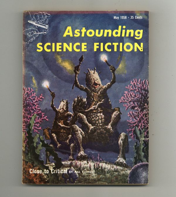 May 1958 - Volume 61, Issue 3 - 1st printing. Science fiction stories by Hal Clement ("Close to Critical" part 1), Charles V. de Vet, Gordon R. Dickson, Frank Herbert, Stanley Mullen, and John Rackham. Illustrations by Freas, Martinez, Wallman, and van Dongen. Cover by van Dongen. Softcover, 5.5-in. x 7.75-in.; 162 newsprint pages, B&W. Cover price $0.35.