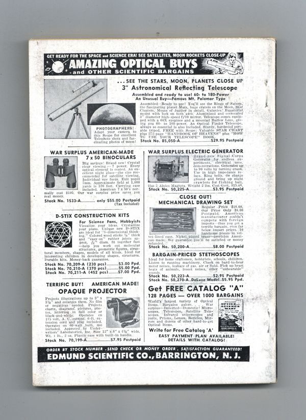 April 1960. Cover by Freas. Stories: "Out Like a Light" (Part 1 of 3) by Mark Phillips, "The Misplaced Battleship" by Harry Harrison, "Make Mine Homogenized" by Rick Raphael, "The Ambulance Made Two Trips" by Murray Leinster, and "The Measure of a Man" by Randall Garrett. Science Fact article: "Demon in a Bottle" by G. Harry Stein. Softcover, 5.5-in. x 7.75-in.; 178 newsprint pages, B&W. Cover price $0.50.