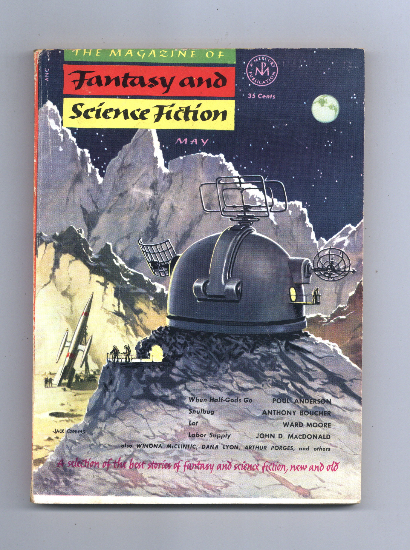 Published May 1953 by Mercury Publications.$29.00May 1953. Cover by Jack Coggins. Science fiction stories: "When Half-Gods Go" by Poul Anderson, "Snulbug" by Anthony Boucher, "Occupation" by Edward W. Ludwig, "Story Conference" by Arthur Porges, "Young-Man-With-Skull-at-His-Ear" byh Levi Crow, "Labor Supply" by John D. MacDonald, "There Did Not Remain a Word to Say" by Winona McClintic, "Leap Year Day" by Tom McMorrow Jr., "Aladdin's Lamp" by Kurd Lasswitz, "Lot" by Ward Moore, and "Mr. Elsie Smith" by Dana Lyon. Softcover, 5.5-in. x 7.5-in.; 132 pages, B&W. Cover price $0.35.