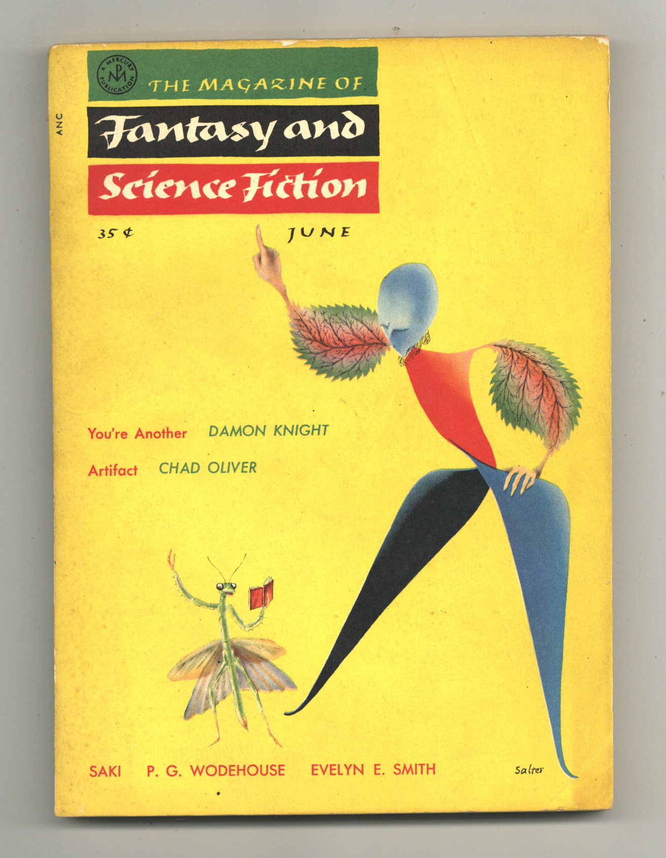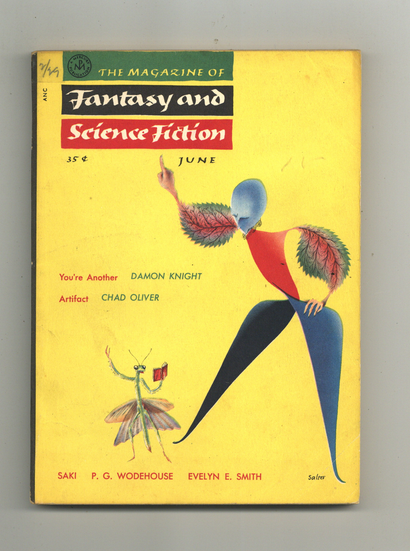 Published Jun 1955 by Mercury Publications.$7.20June 1955. Cover by George Salter. Science fiction stories: "You're Another" by Damon Knight, "Created He Them" by Alice Eleanor Jones, "The Soul of Laploshka" by Saki, "The Adventure of the Ball of Nostradamus" by Mack Reynolds and August Derleth, "The Faithful Friend" by Evelyn E. Smith, "Astronomy Lesson" by Willard Marsh, "Walk Like a Mountain" by Manly Wade Wellman, P.G. Wodehouse, "The New Sound" by Charles Beaumont, and "Artifact" by Chad Oliver. Softcover, 5.5-in. x 7.5-in.; 132 pages, B&W. Cover price $0.35.